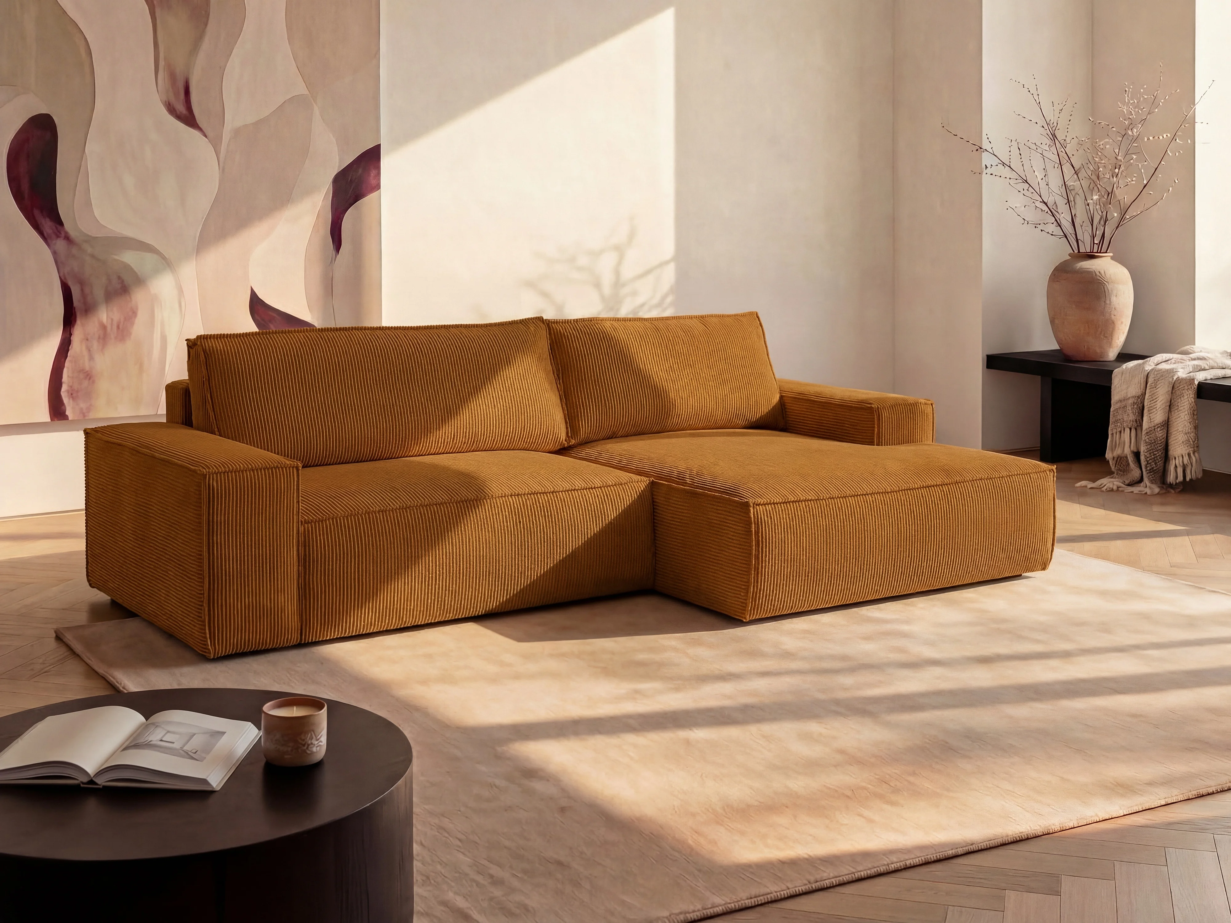 Canapé d'angle droit convertible en velours côtelé orange clair AMELIA