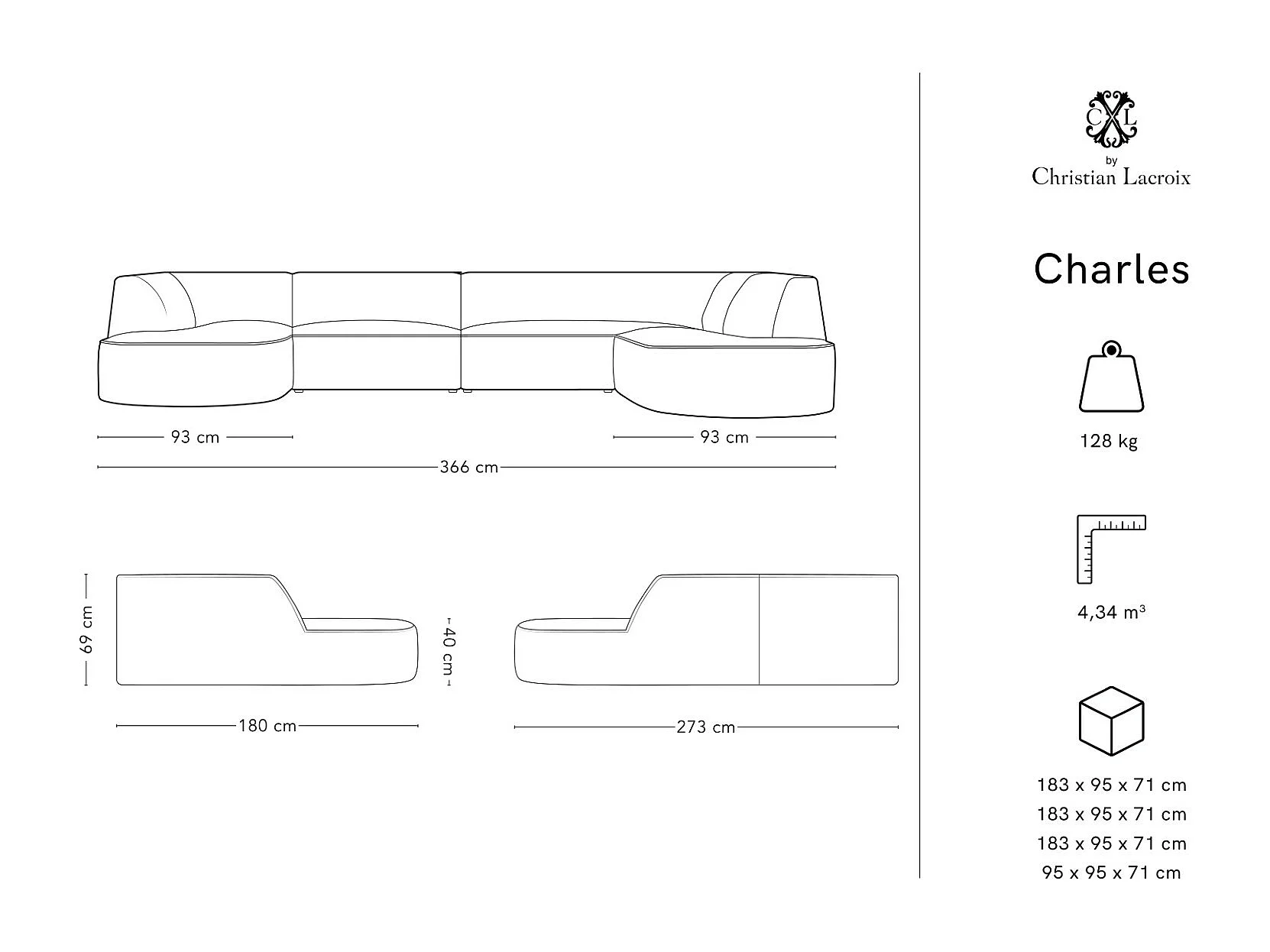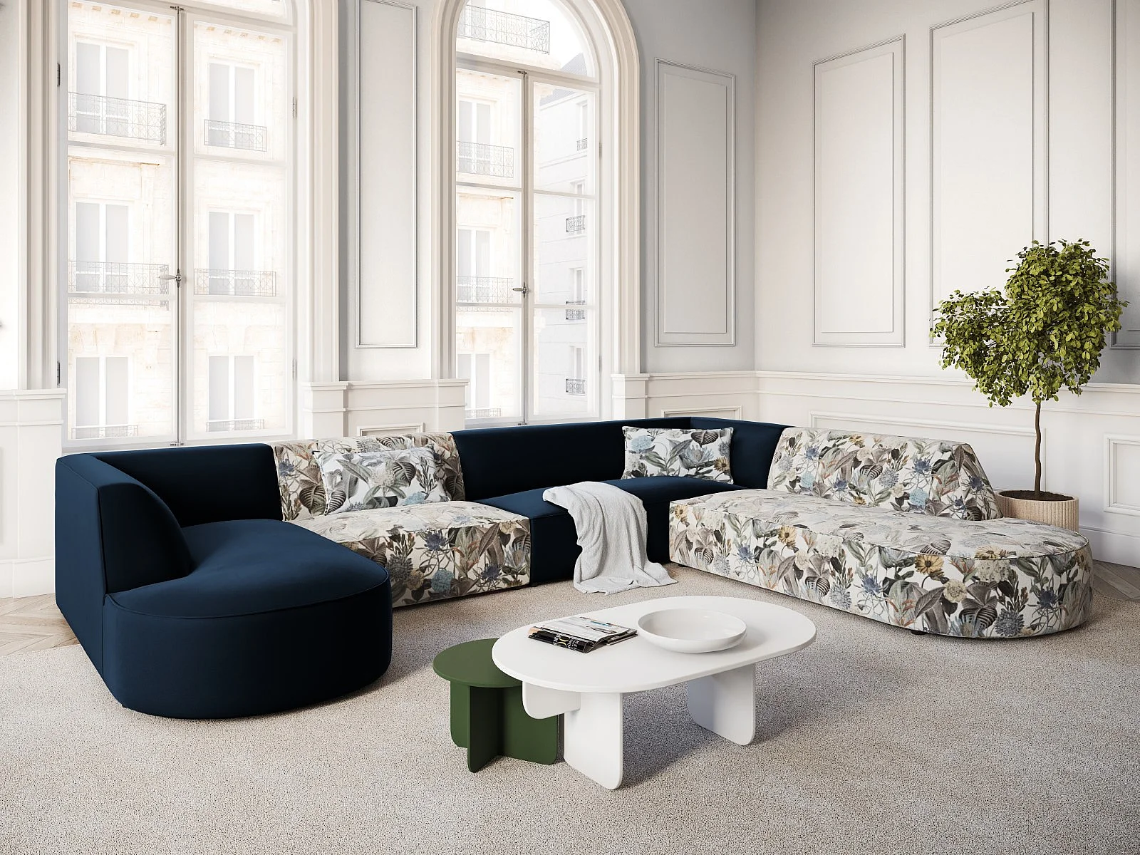 CXL by Christian Lacroix - Canapé d'angle droit panoramique "Charles" 7 places en velours motif de jardin bleu clair,bleu foncé - 366x273x69cm