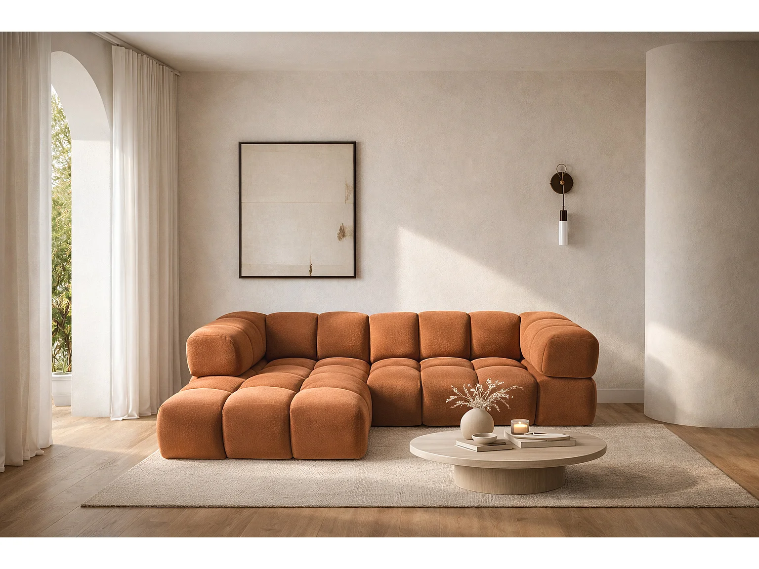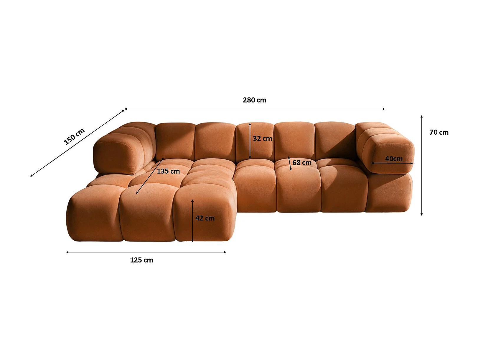 Canapé d'angle en L Averro, tissu Bluvel, couleur cannelle, à gauche