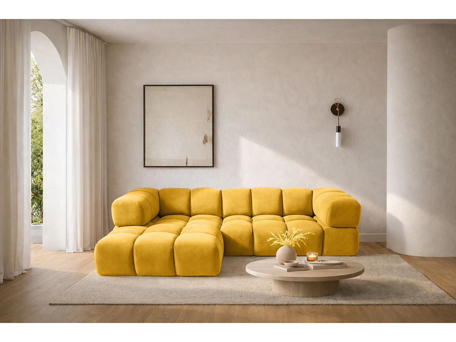 Canapé d'angle en L Averro, tissu Bluvel, doré, gauche