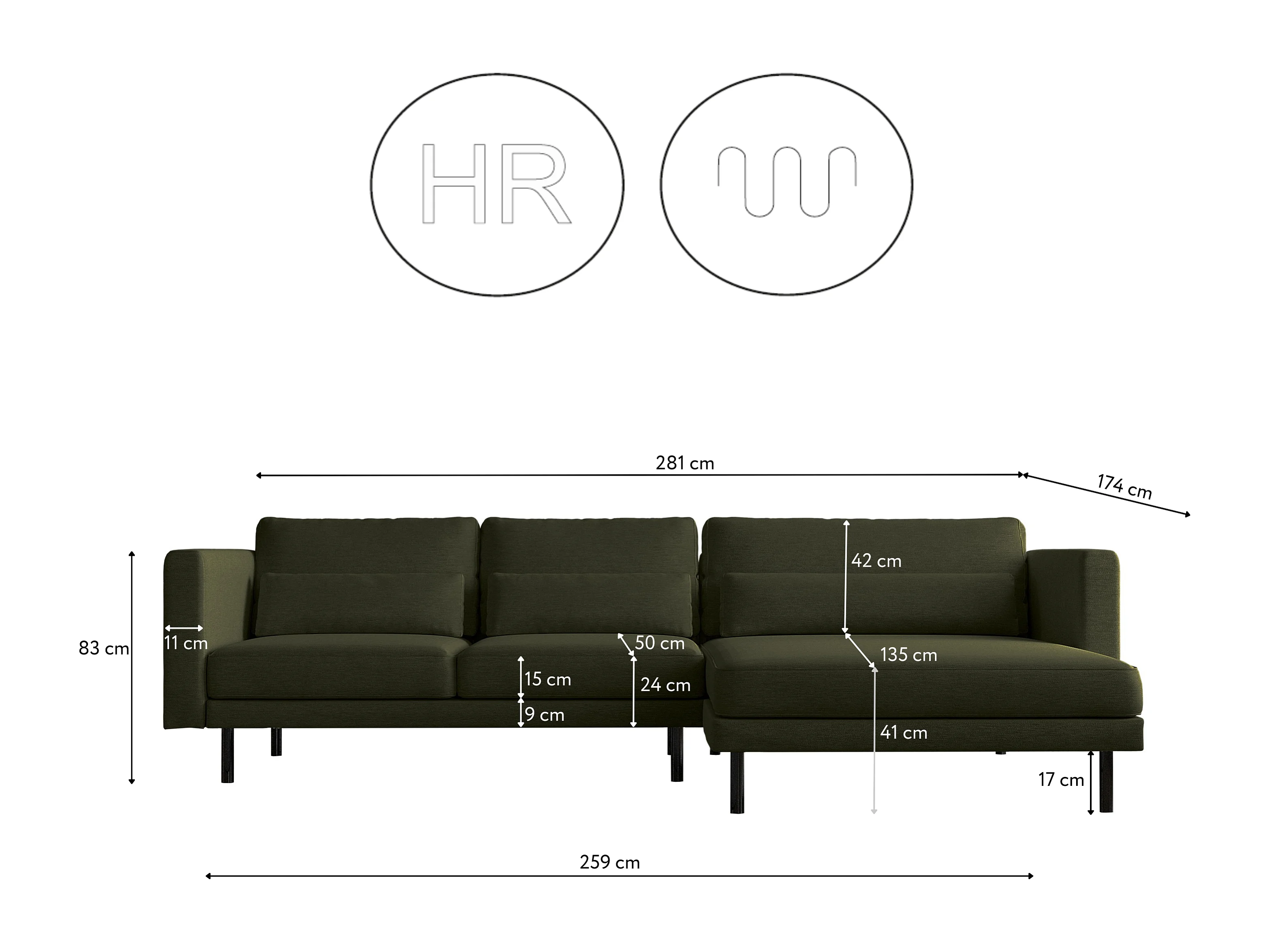 Canapé d'angle en L Dani moderne et spacieux tissu Verita vert foncé droite