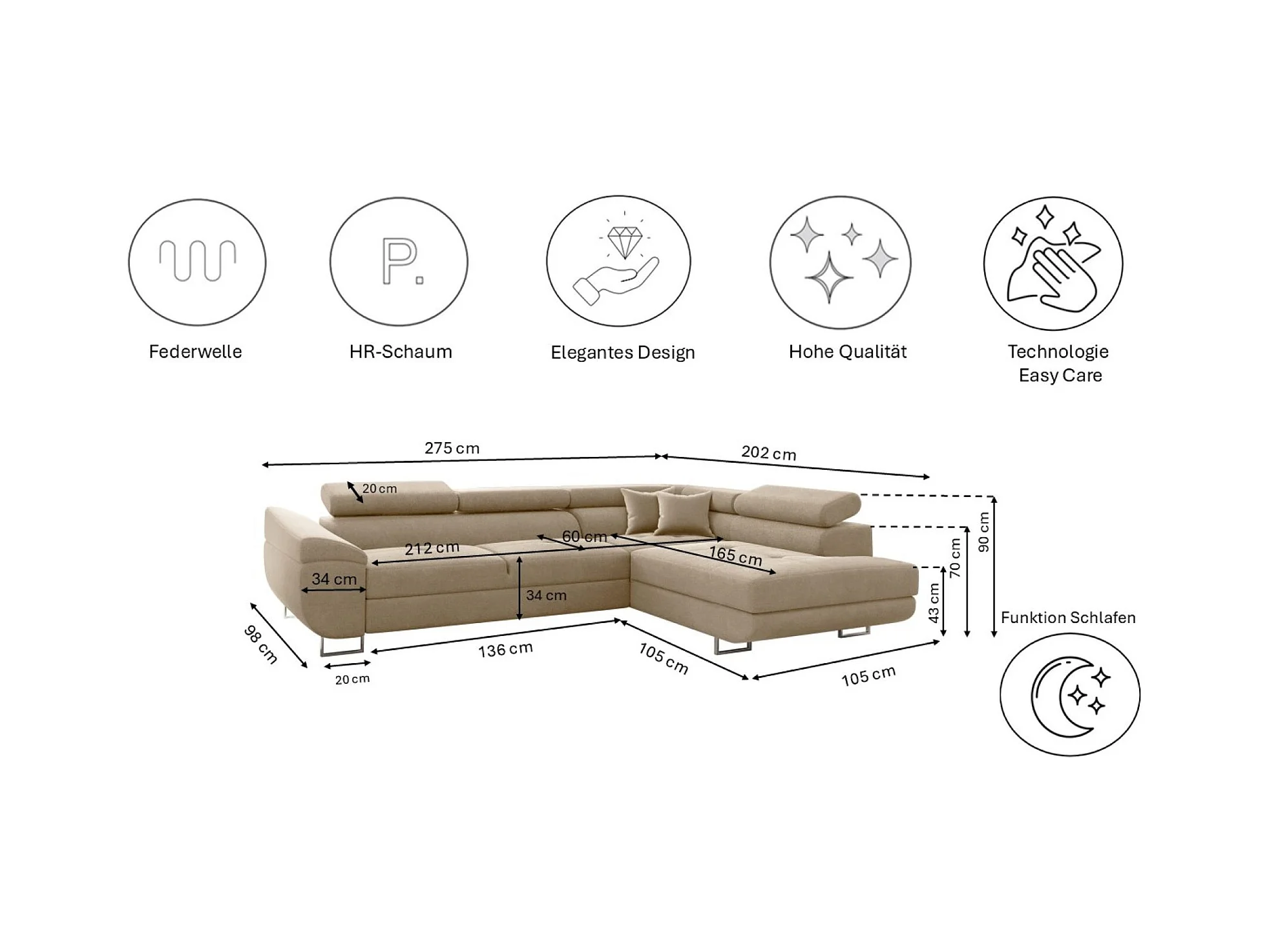 Canapé d'angle en L FALIO avec fonction couchage, tissu Noel, beige clair, droit