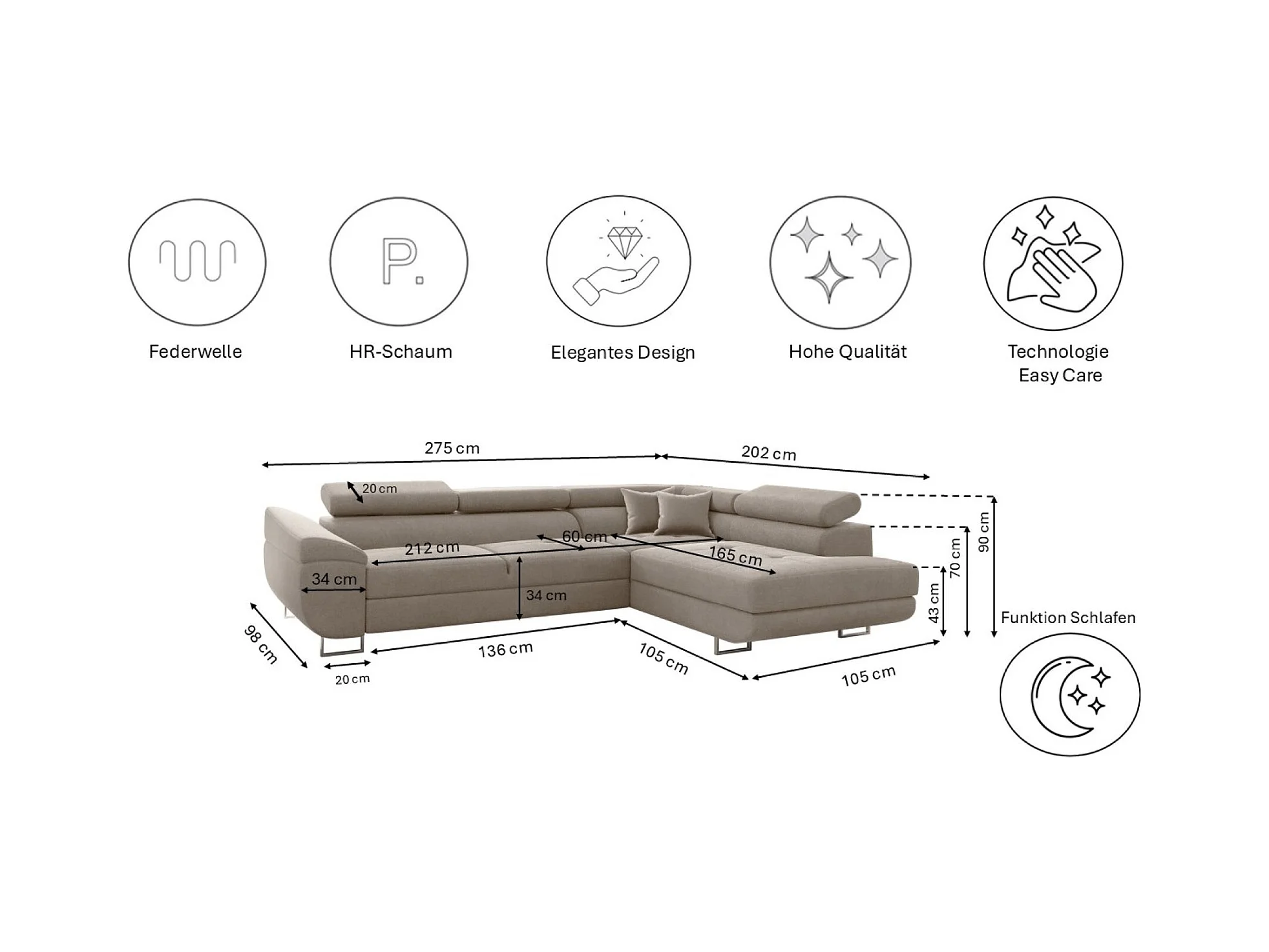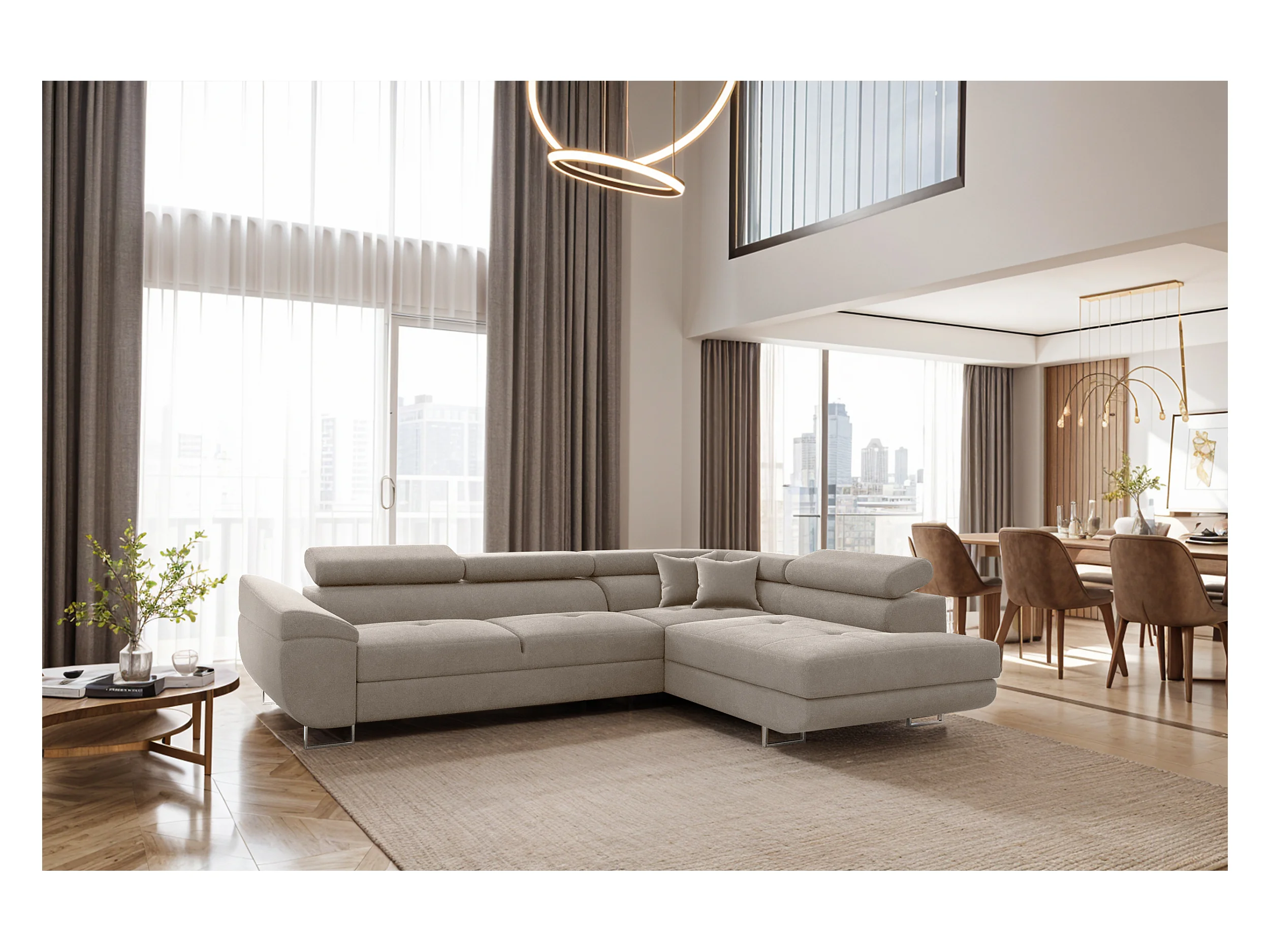 Canapé d'angle en L FALIO avec fonction couchage, tissu Noel, beige froid, droite