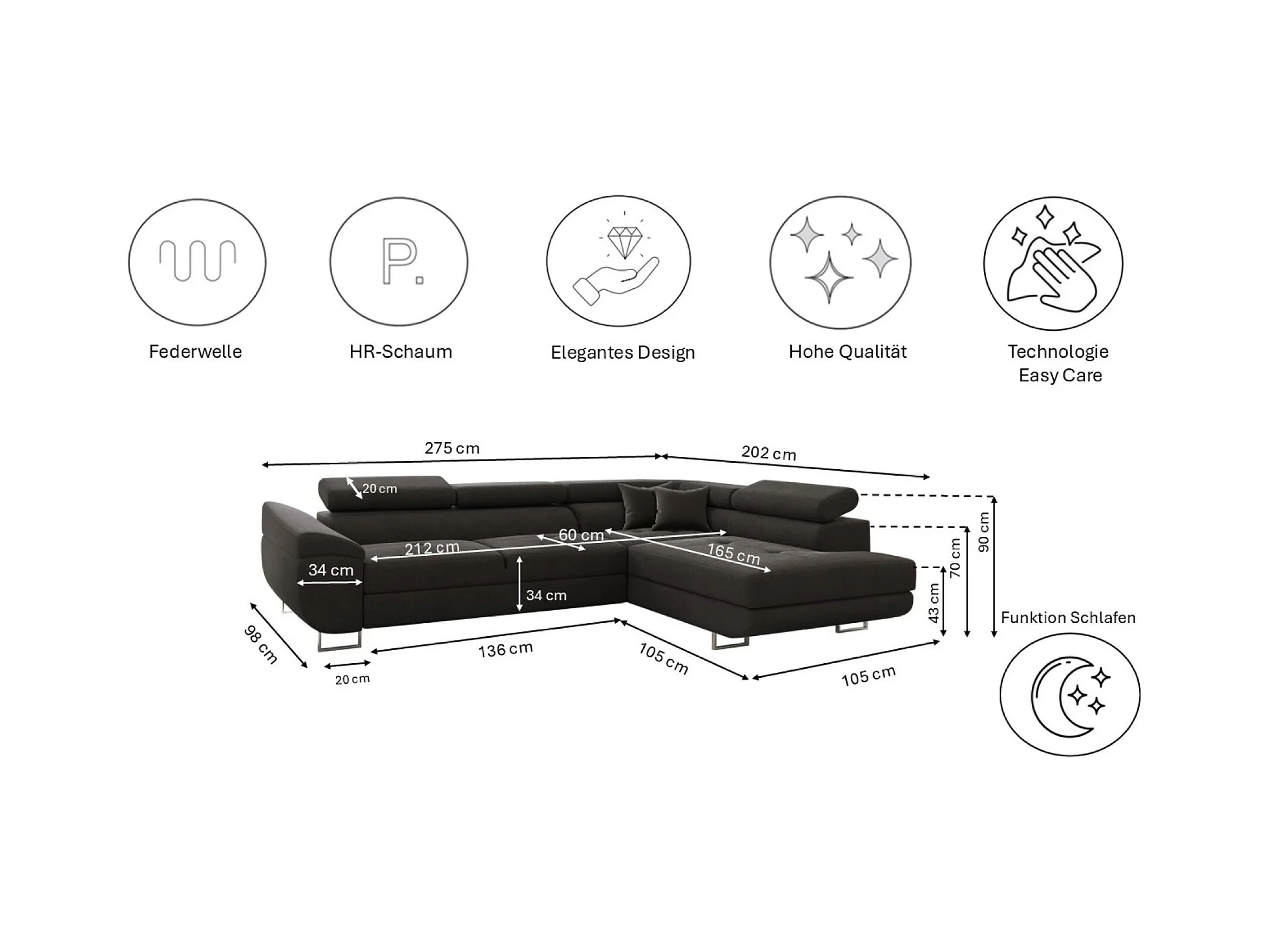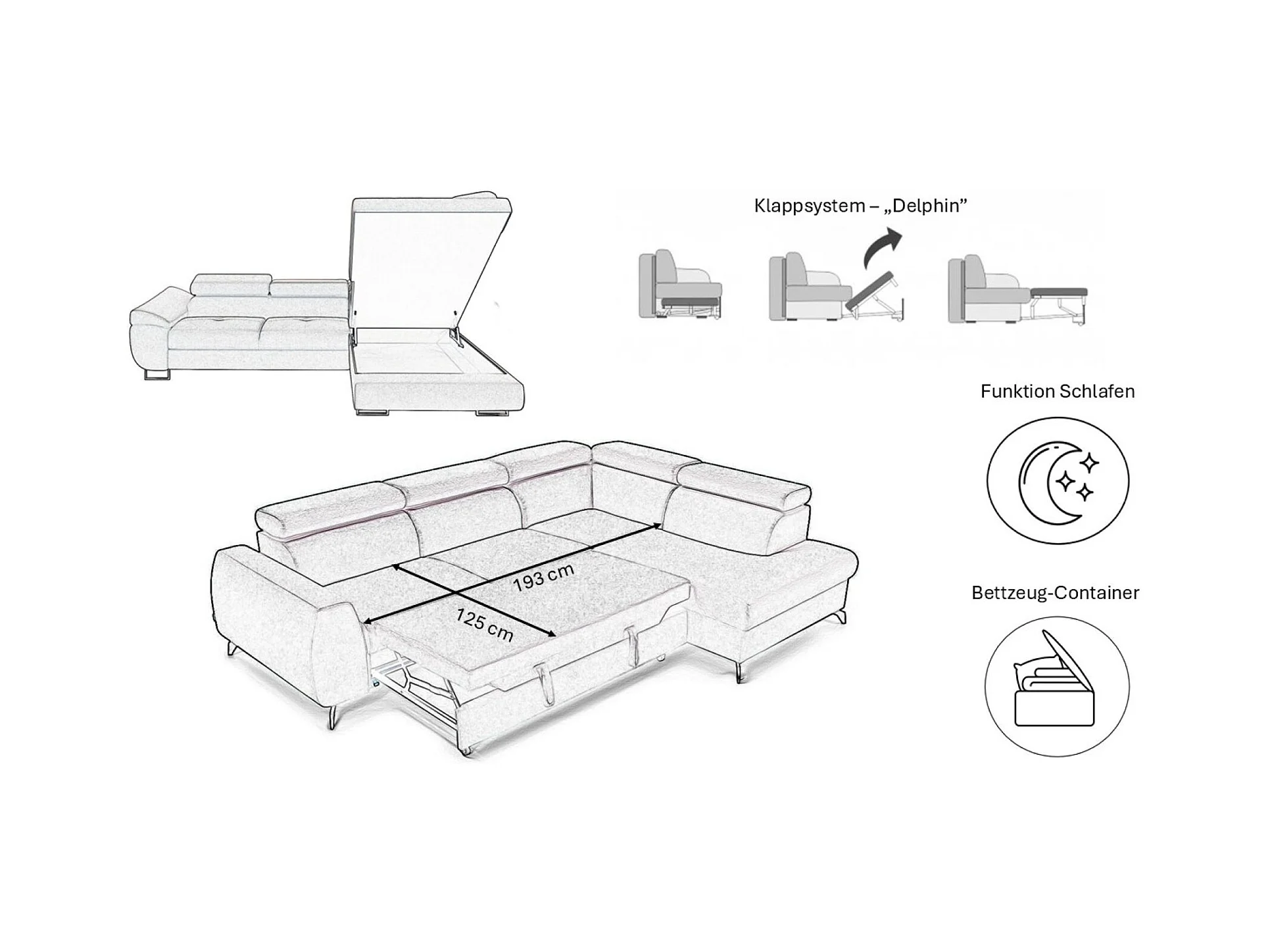Canapé d'angle en L FALIO avec fonction couchage, tissu Noel, graphite, droit