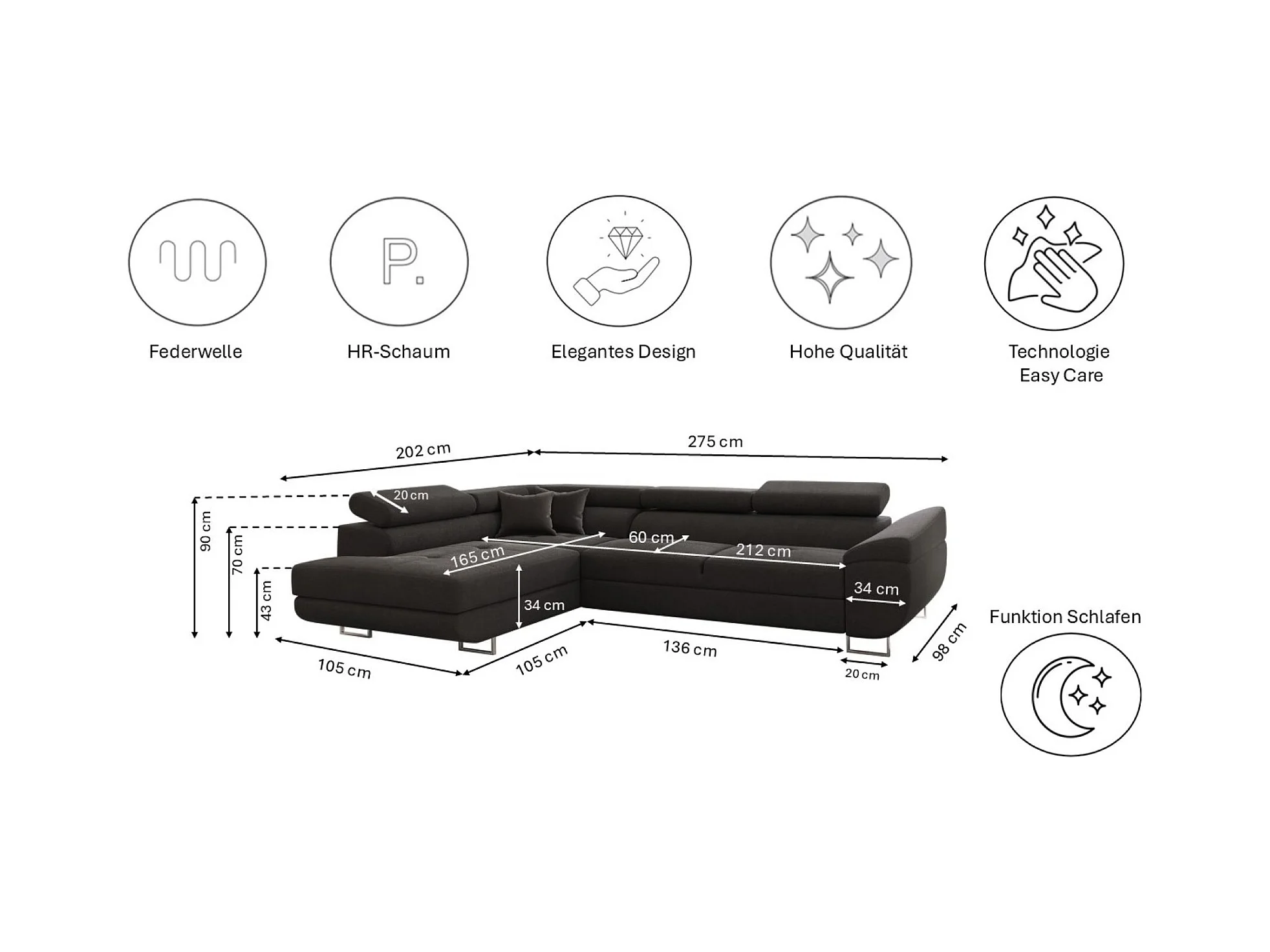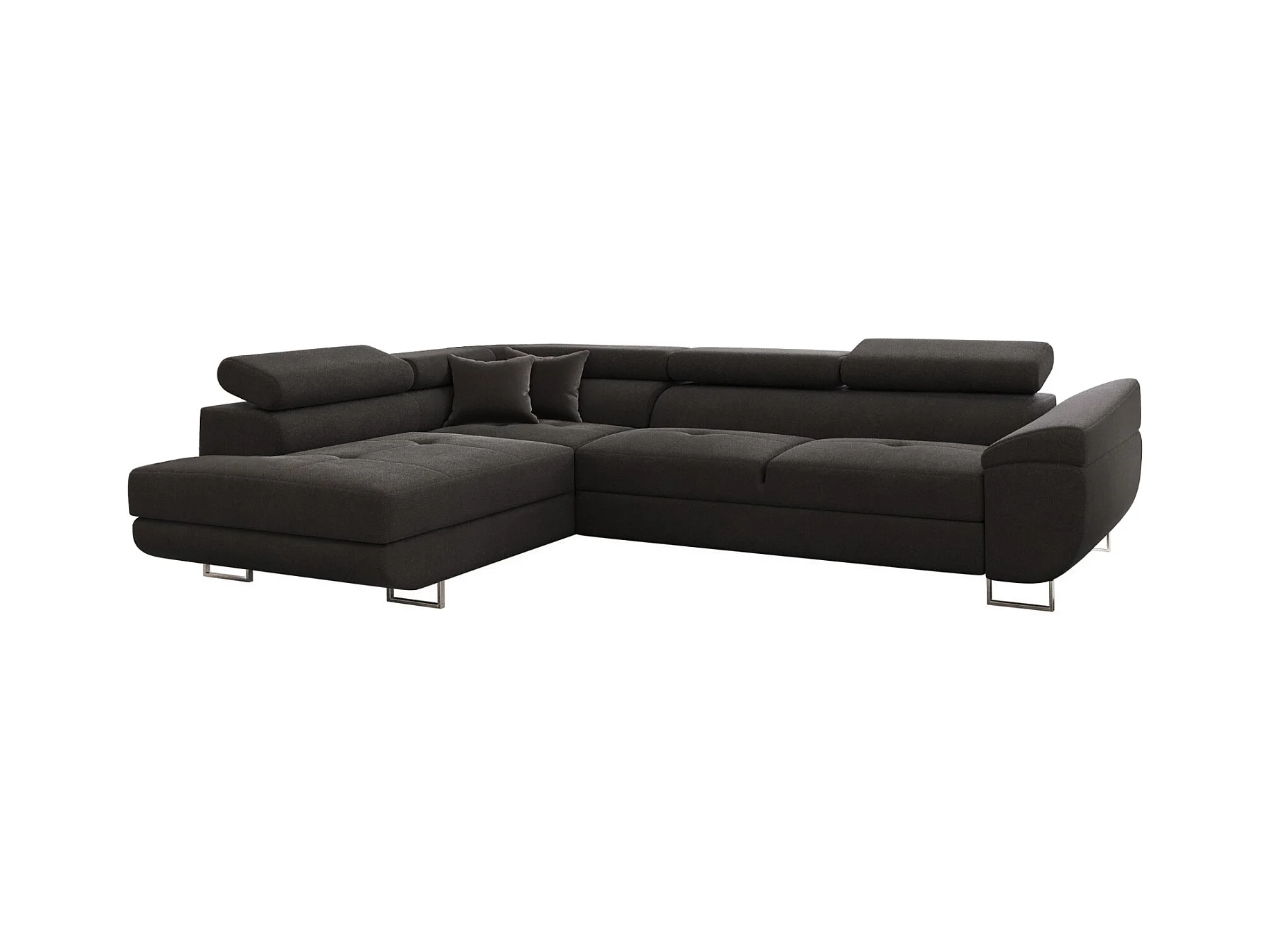 Canapé d'angle en L FALIO avec fonction couchage, tissu Noel, graphite, gauche