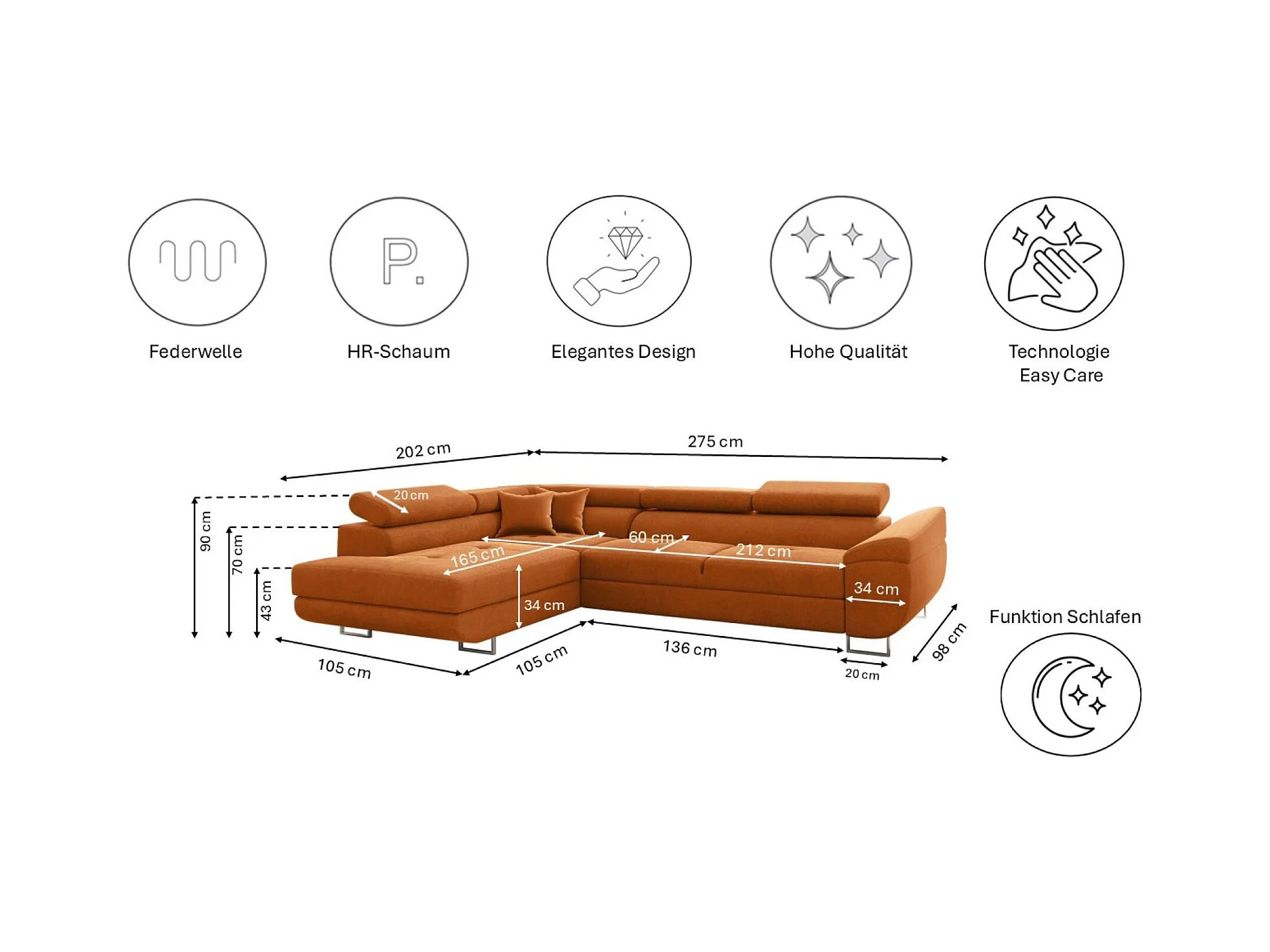 Canapé d'angle en L, collection premium ELLA, tissu Noel, orange, gauche