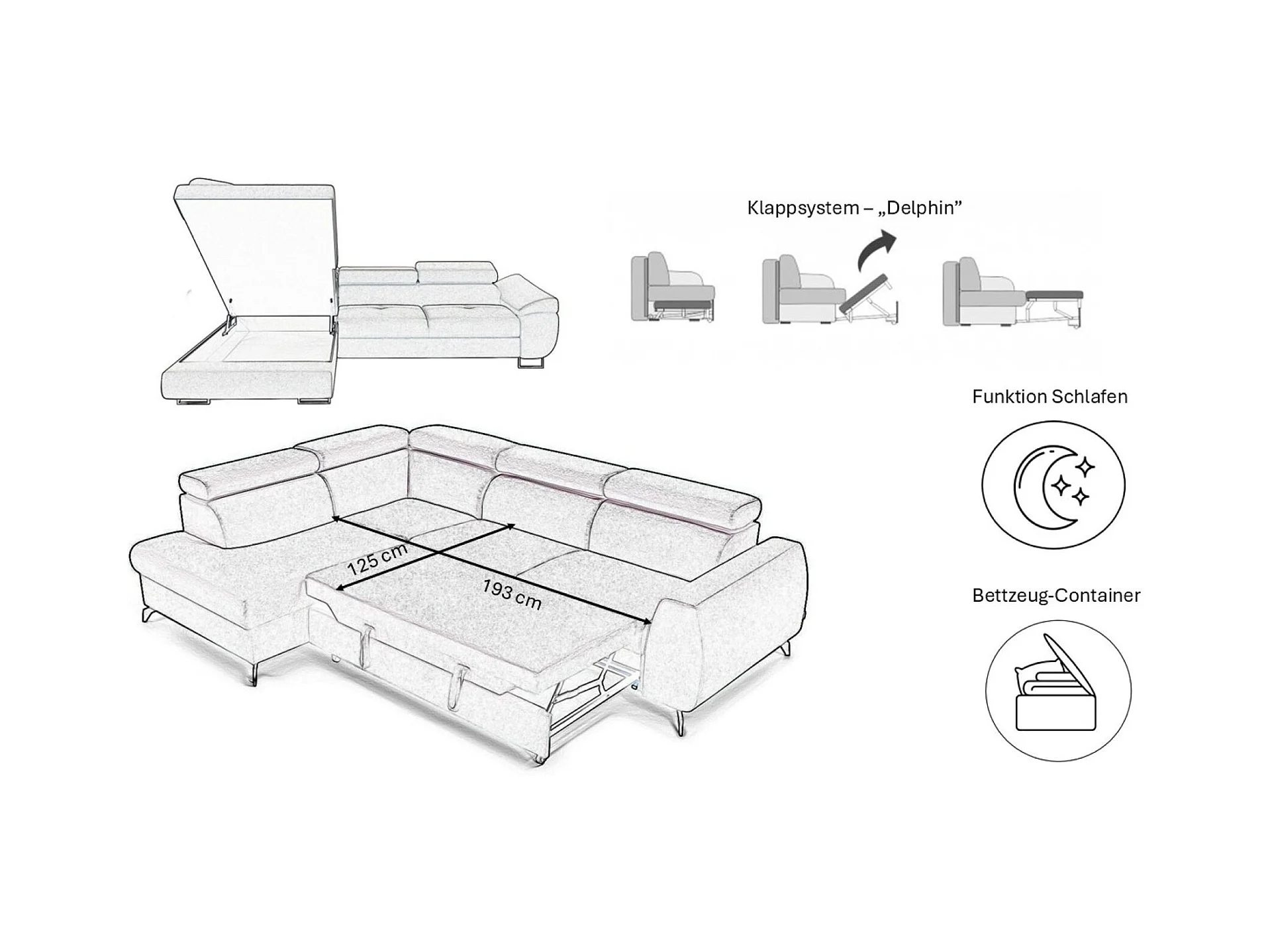 Canapé d'angle en L FALIO avec fonction couchage, tissu Noel, orange, gauche