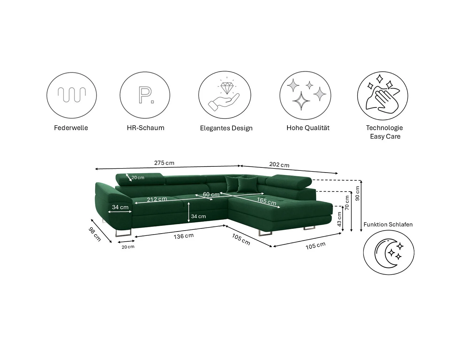 Canapé d'angle en L FALIO avec fonction couchage, tissu Noel, vert foncé, droite