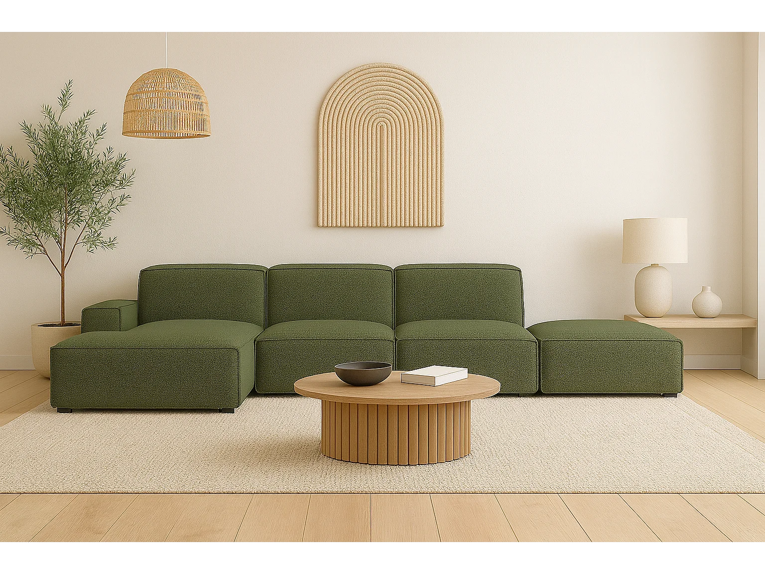 Canapé d'angle en L + repose-pieds Cursal, tissu Artico, Moss, gauche