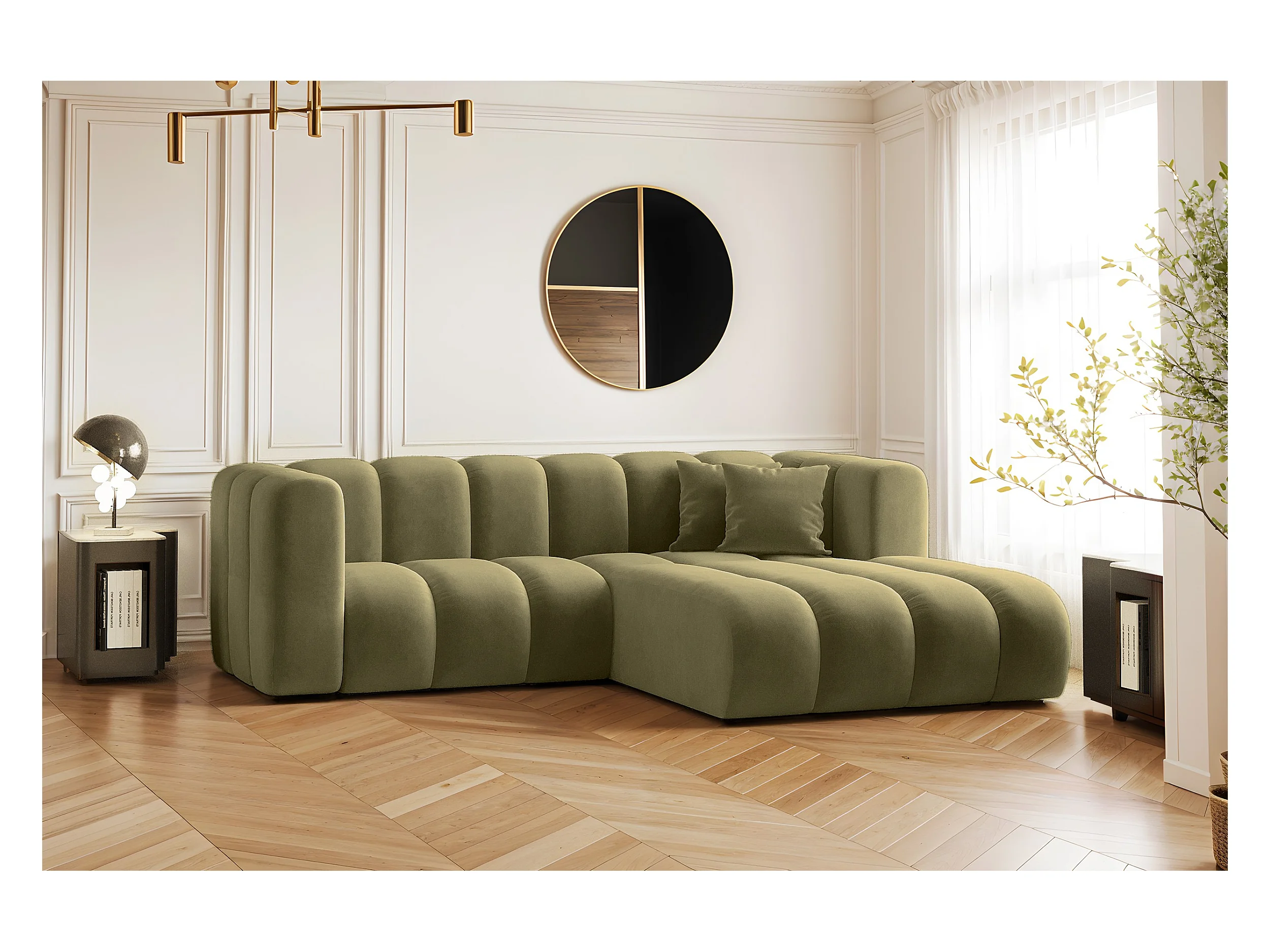 Canapé en L Modena, canapé d'angle moderne et confortable en tissu Salvador droit olive