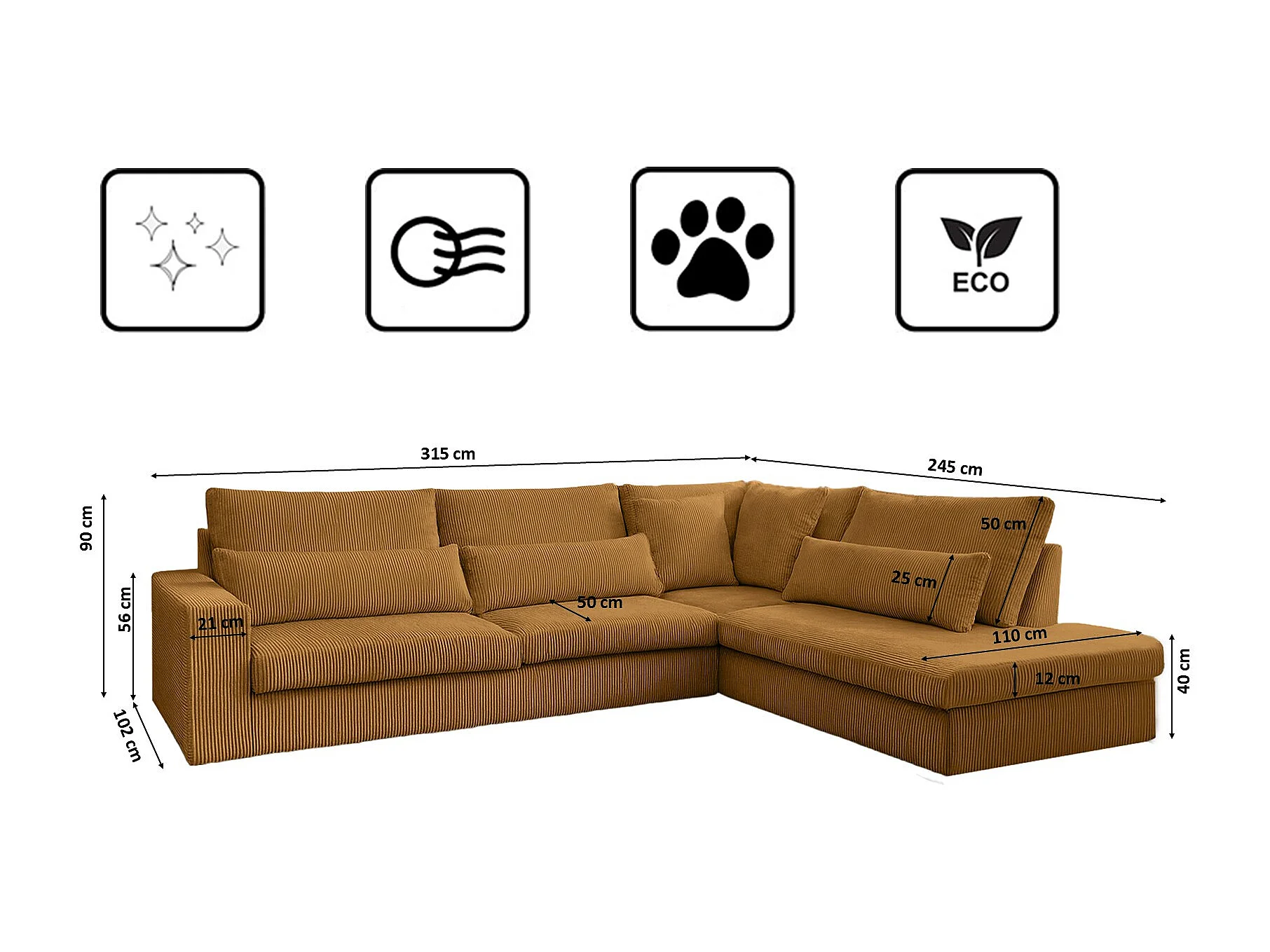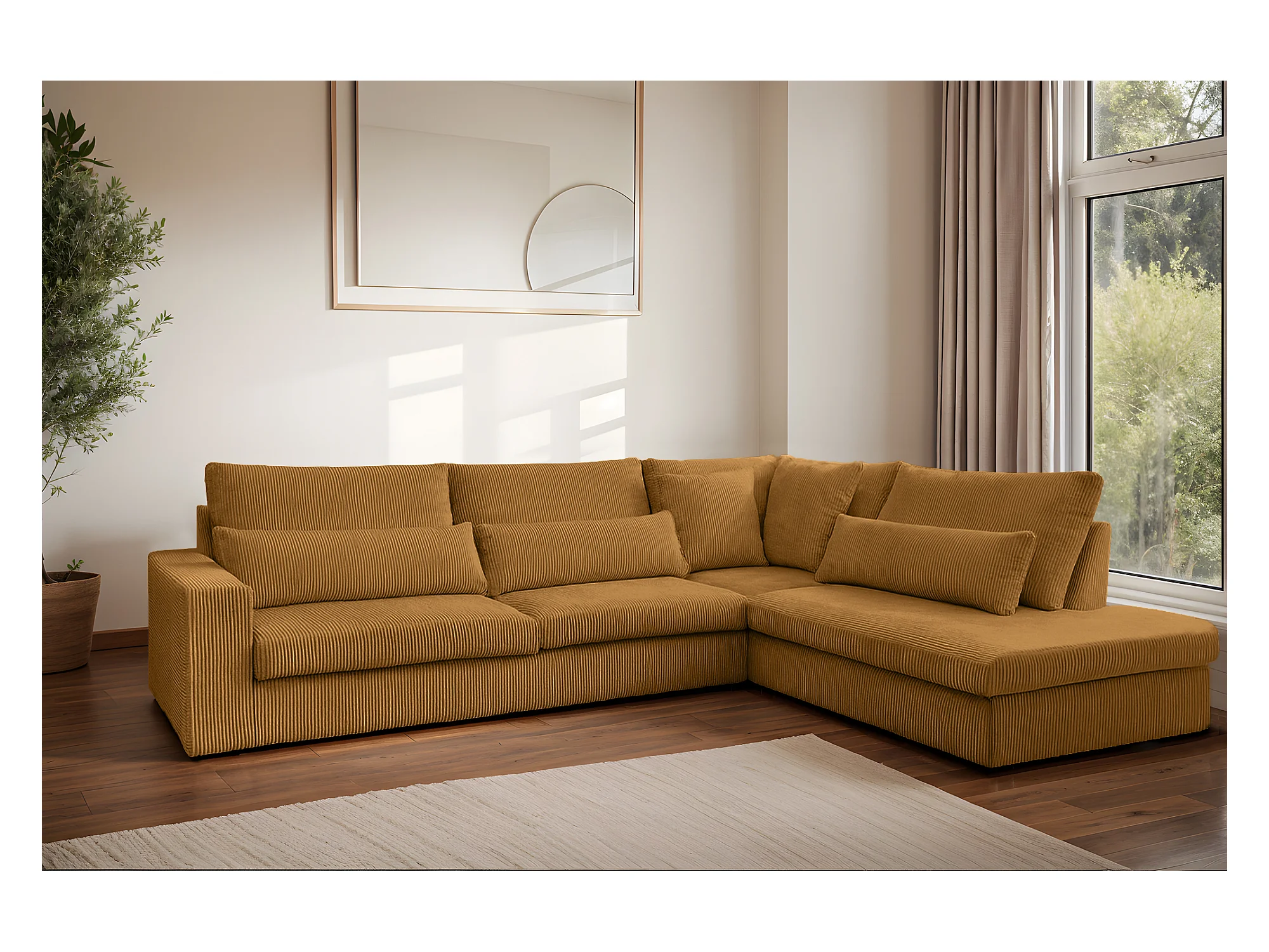 Cosmopolitan Design - Canapé d'angle droit "Arendal" 5 places en chenille avec un effet côtelé moutarde - 341x166x70cm