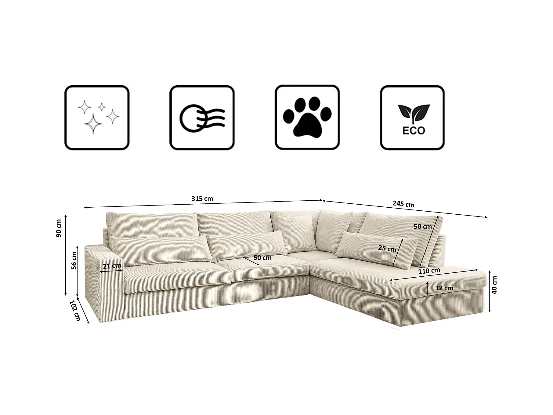 Canapé d'angle en L SVEN tissu Poso Ecru droit