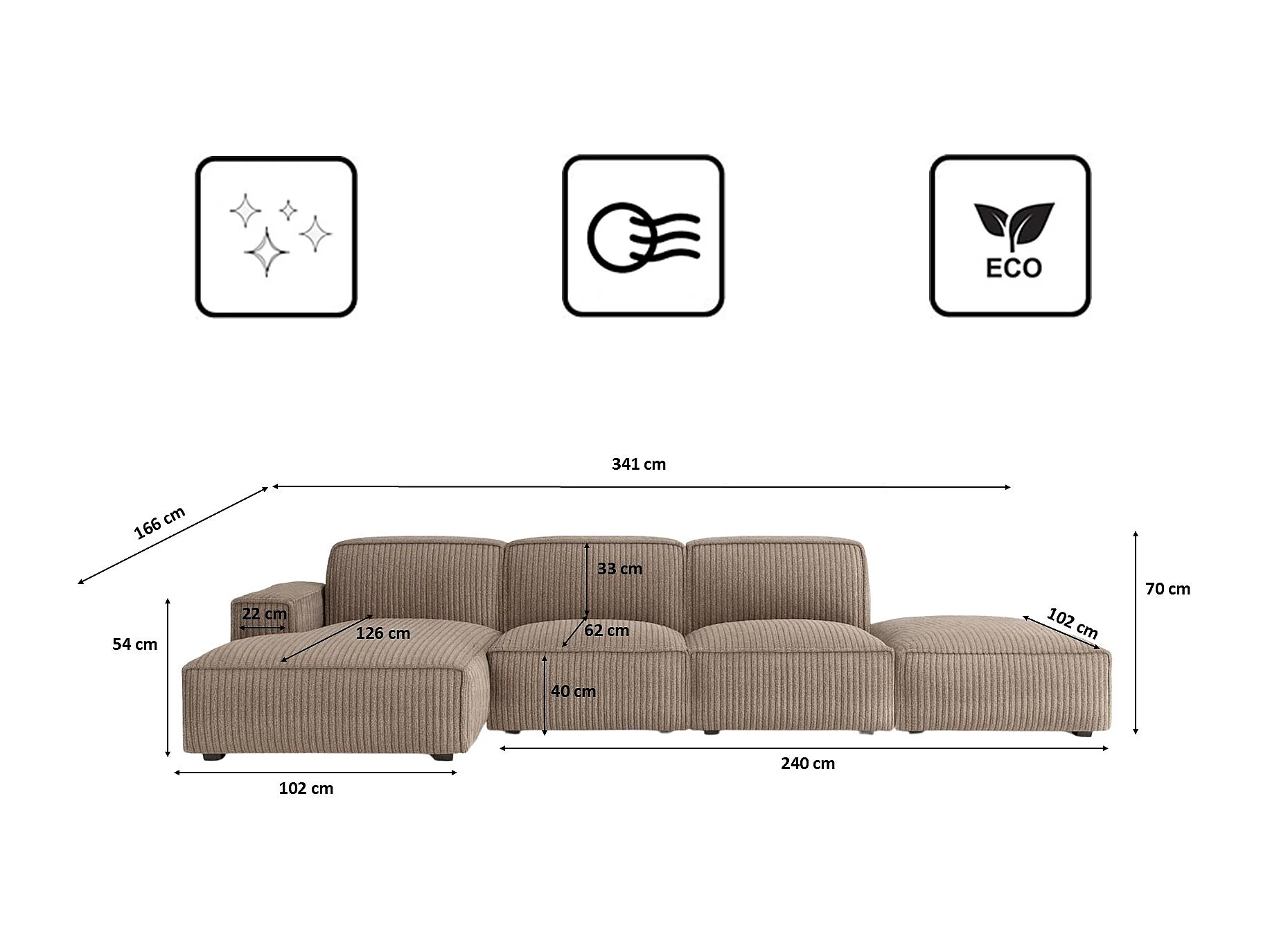 Canapé d'angle en L + tabouret Cursal, tissu Poso, beige foncé, gauche