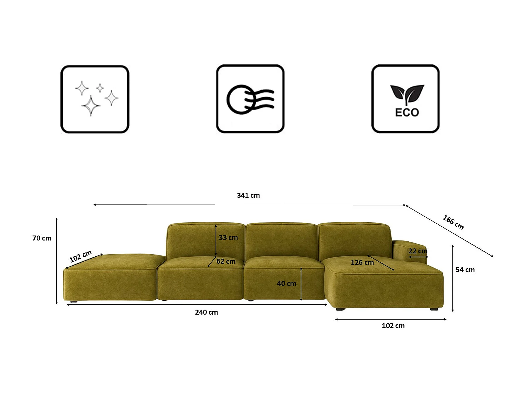 Canapé d'angle en L + tabouret Cursal, tissu Salvador, olive, droit