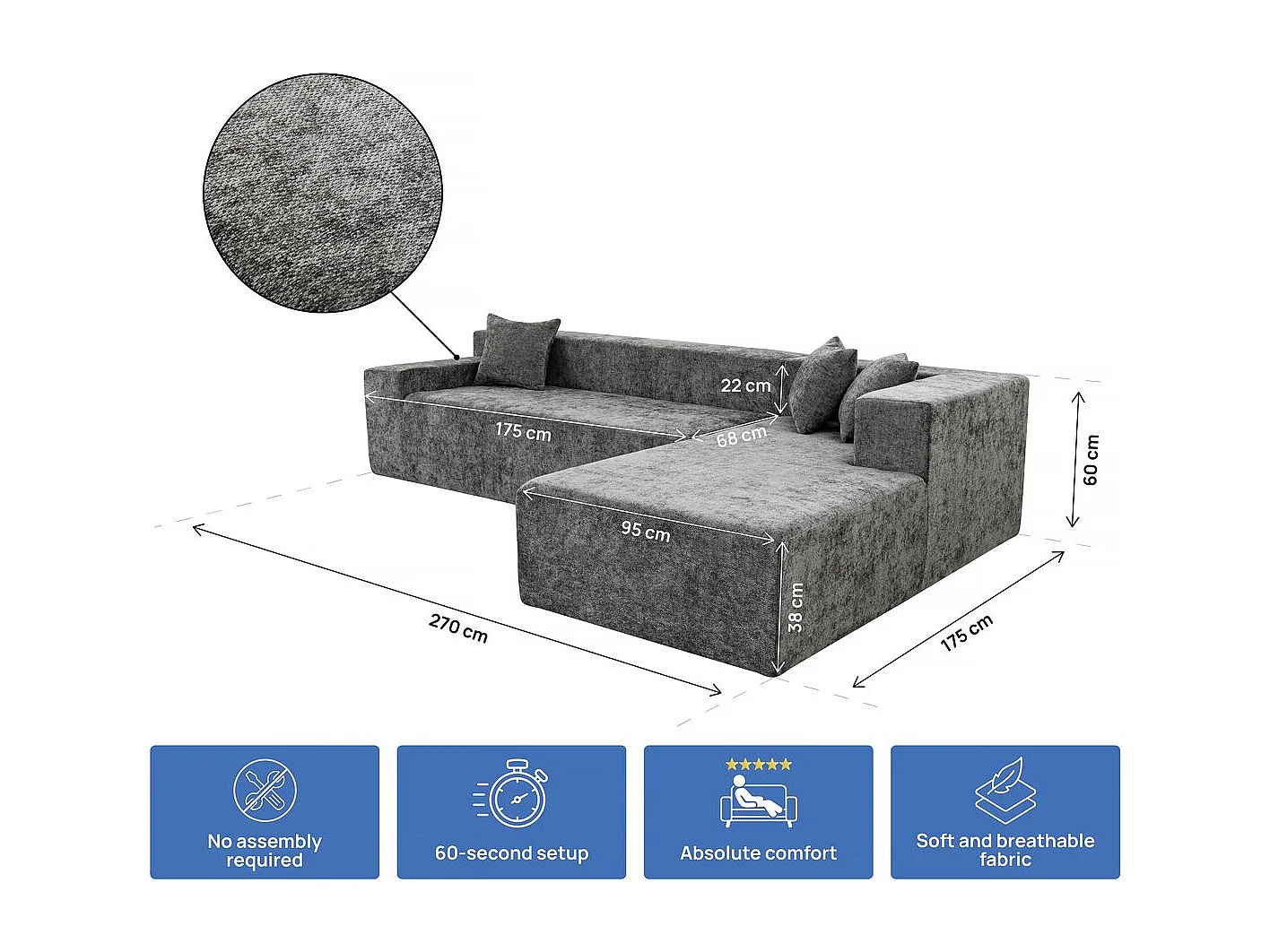 Canapé d'angle en tissu texturé "Tessaro" - 4 places - Gris