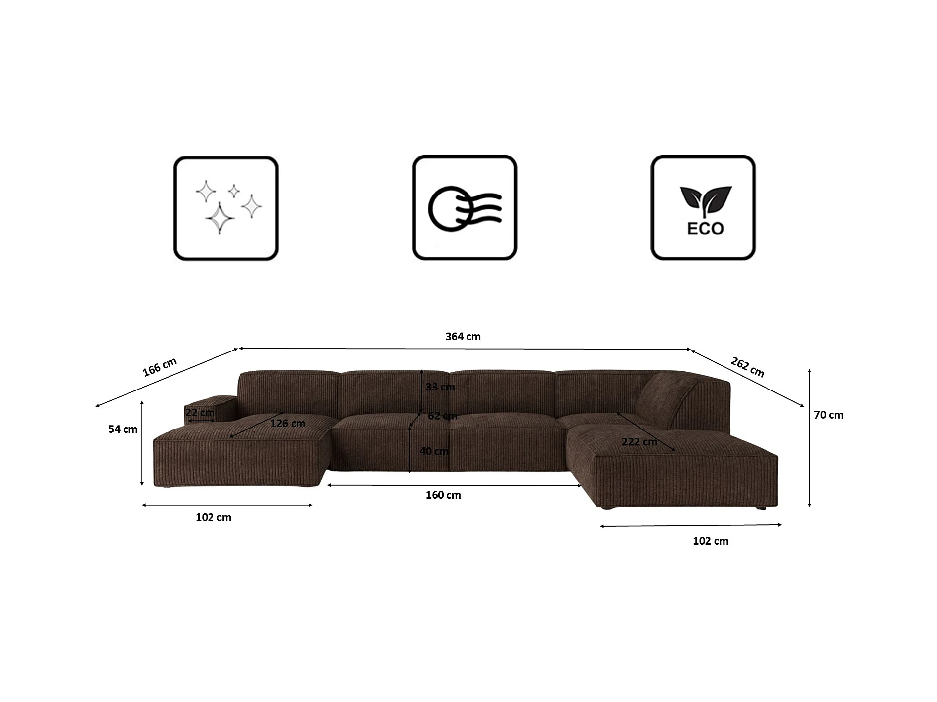 Canapé d'angle en U Cursal V, tissu Poso, marron, droit