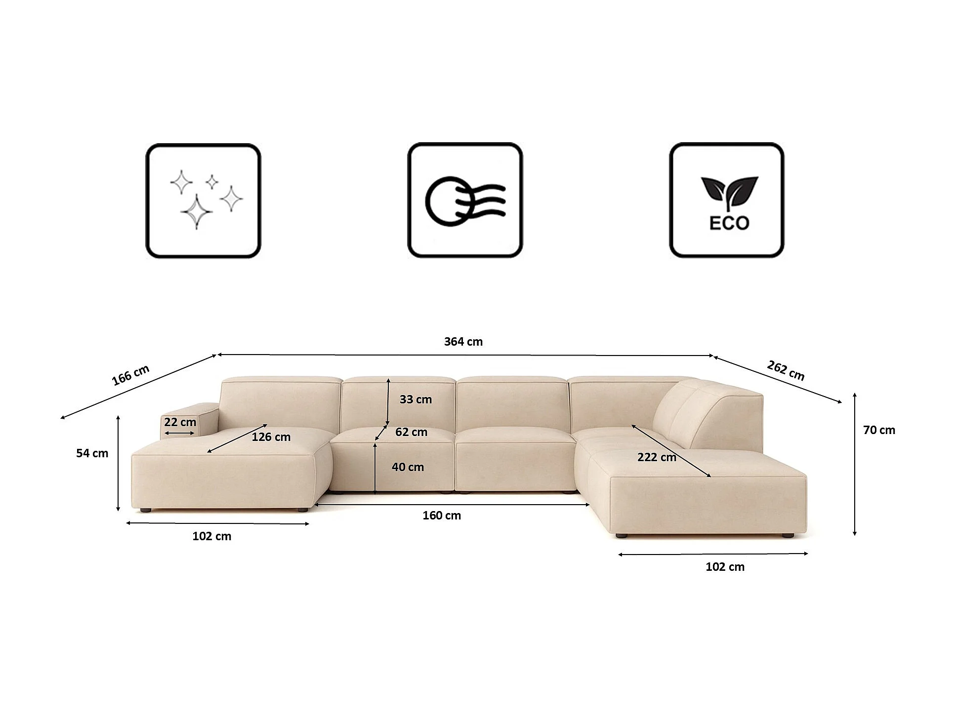 Canapé d'angle en U Cursal V, tissu Salvador, beige, droit