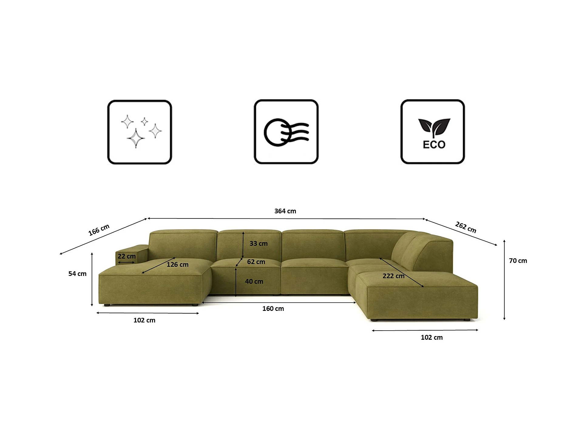 Canapé d'angle panoramique 6 places tissu doux vert Largos 362cm