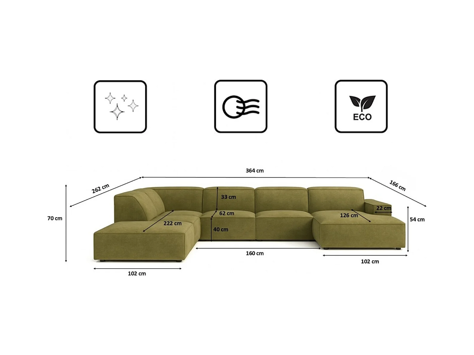 Canapé d'angle panoramique 6 places tissu doux vert Largos 362cm