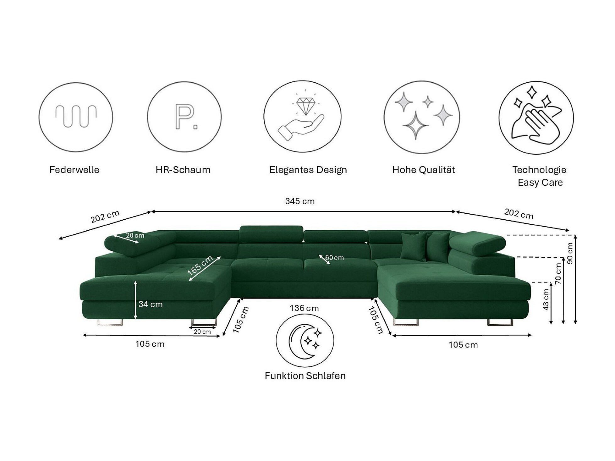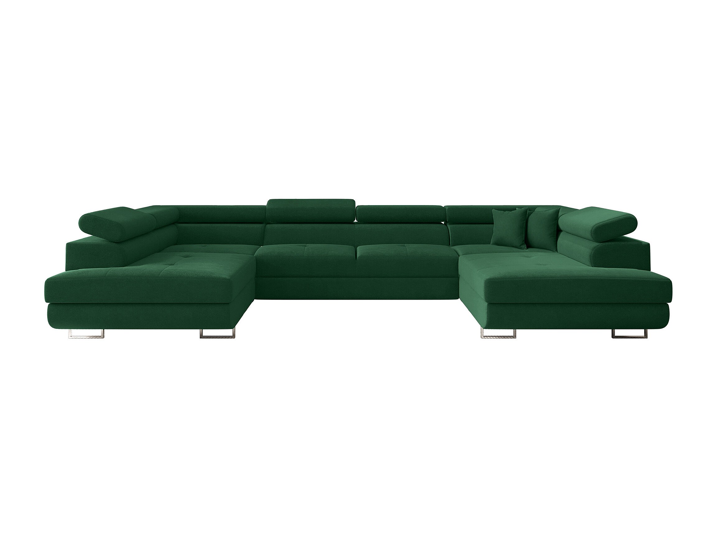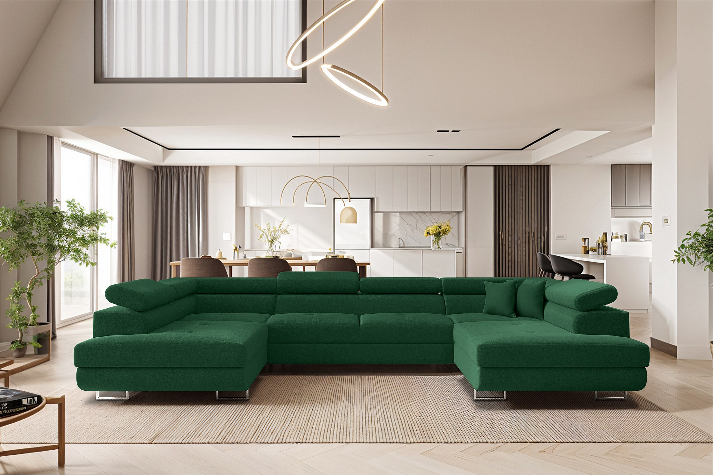 Canapé d'angle en U FALIO avec fonction couchage, tissu Noel, vert foncé