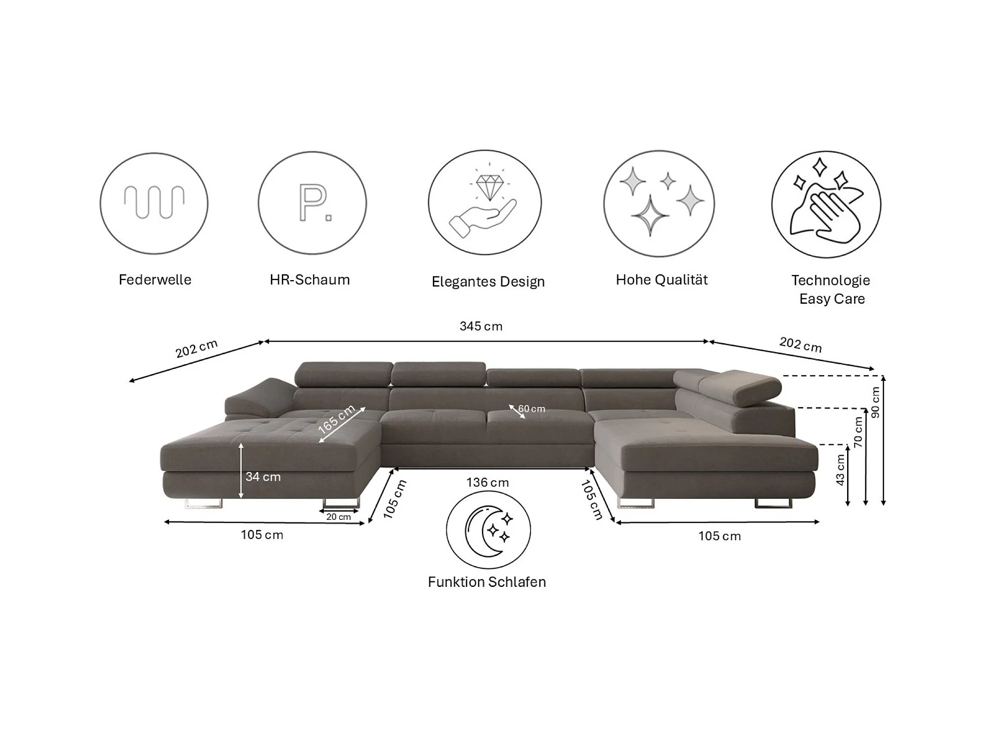 Canapé d'angle en U FALIO II avec fonction couchage, tissu Noel, gris, droit