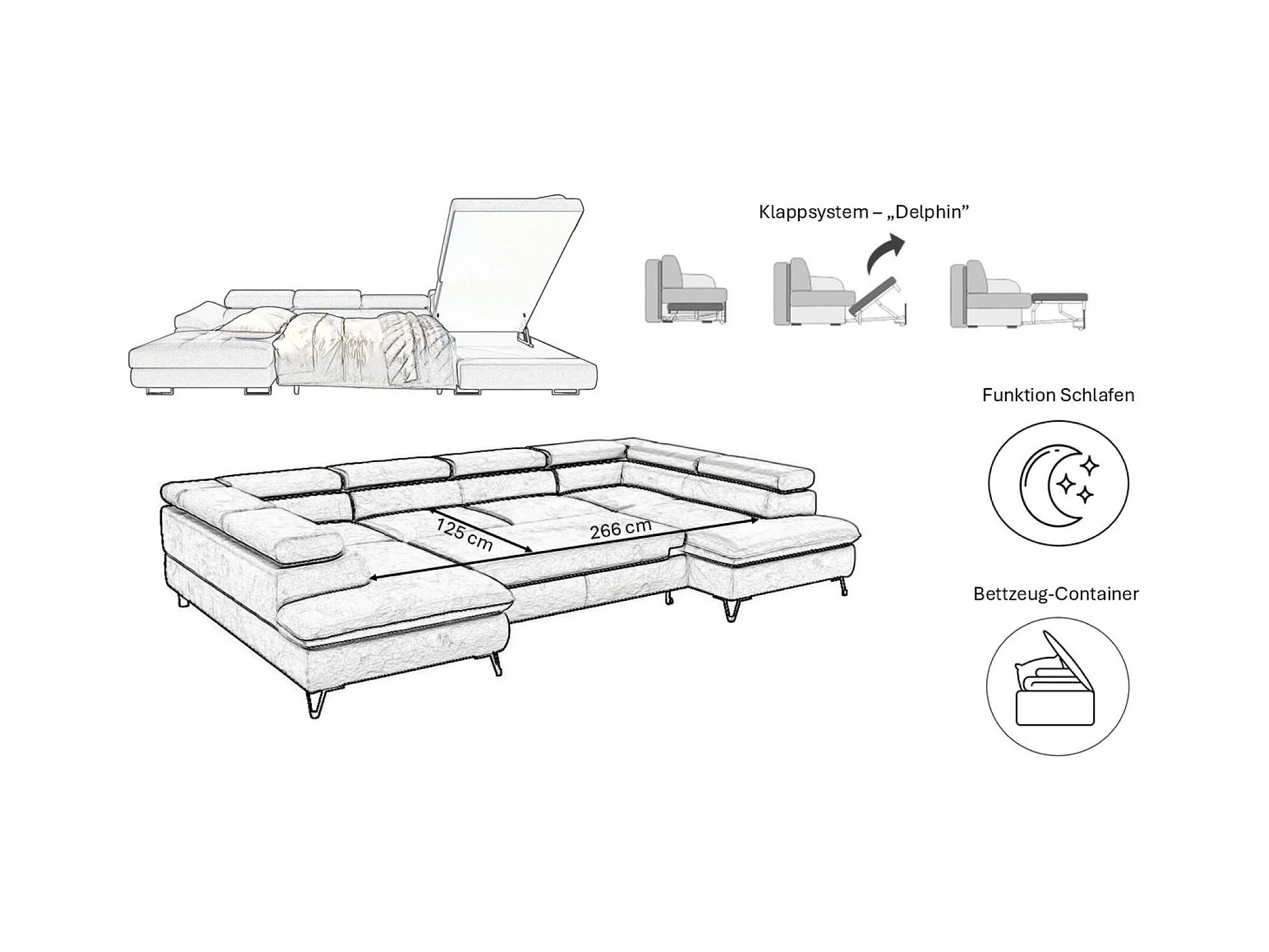 Canapé d'angle en U FALIO avec fonction couchage, tissu Noel, gris