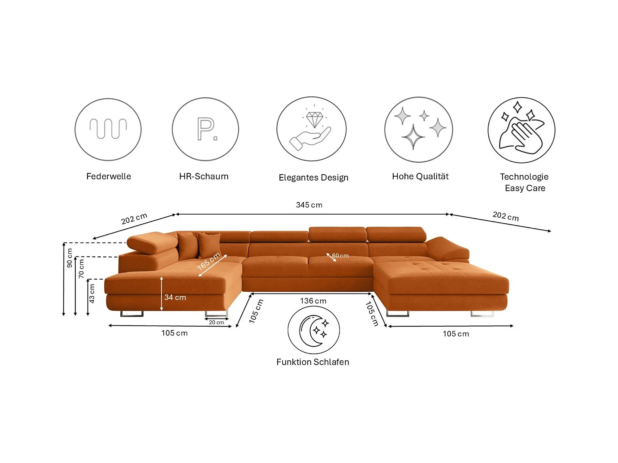 Canapé d'angle en U FALIO avec fonction couchage, tissu Noel, orange