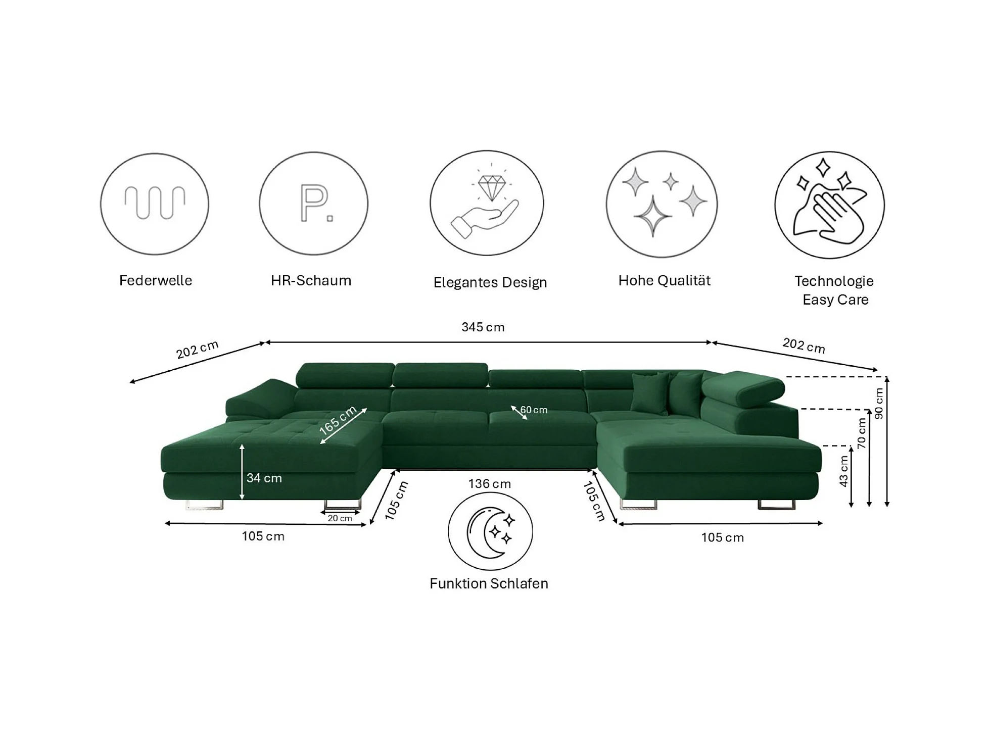 Canapé d'angle en U FALIO avec fonction couchage, tissu Noel, vert foncé