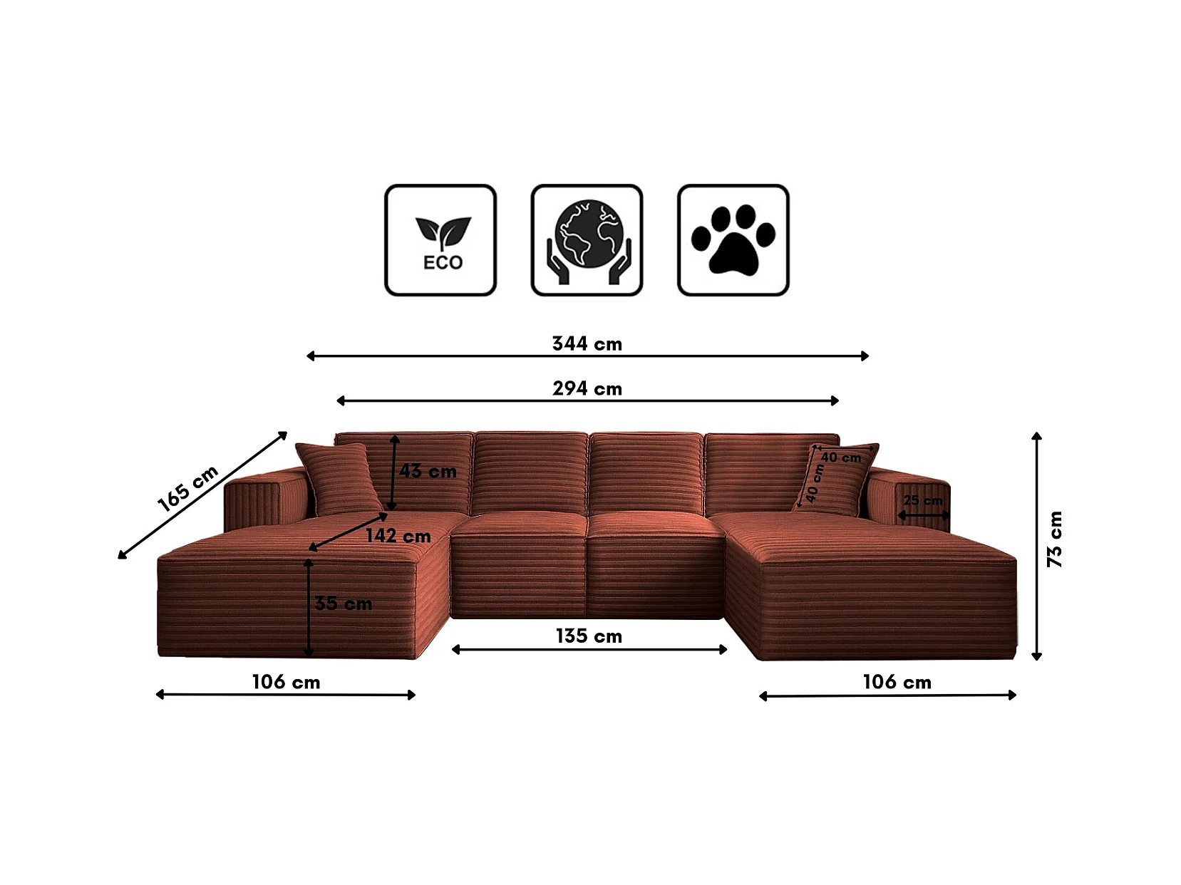 Canapé d'angle PULA, tissu Opera Velvet, brique