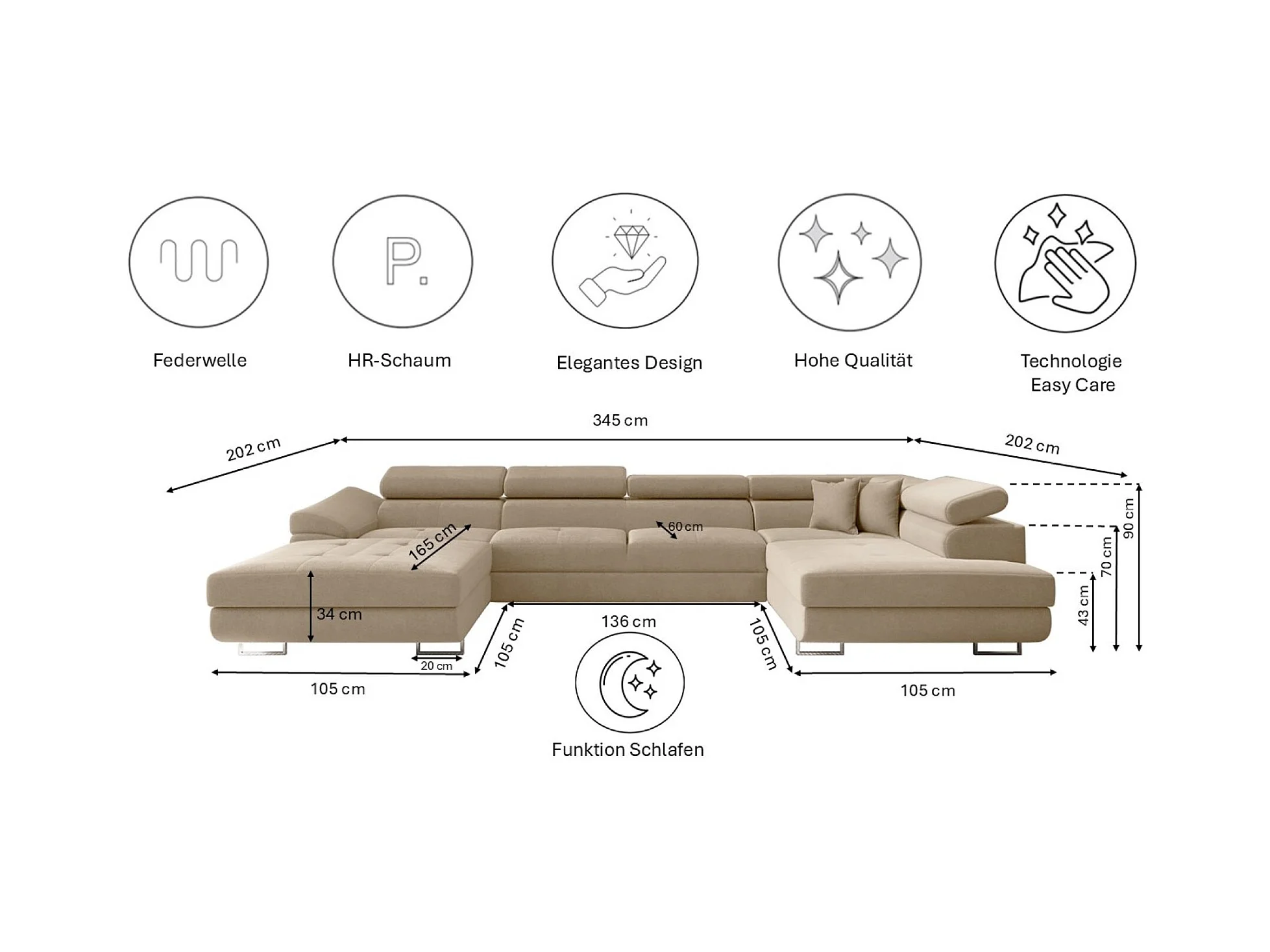 Canapé d'angle en U FALIO avec fonction couchage, tissu Noel, beige clair