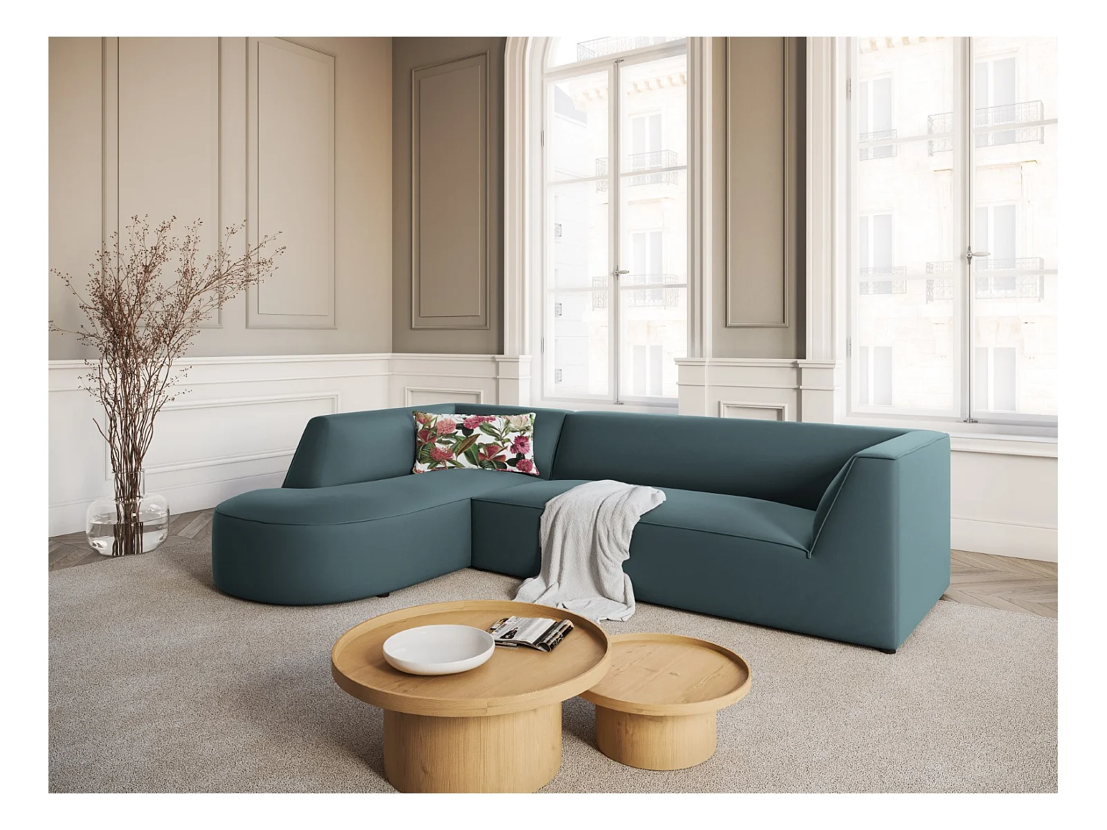 CXL by Christian Lacroix - Canapé d'angle gauche "Charles" 4 places en velours bleu - 273x180x69cm