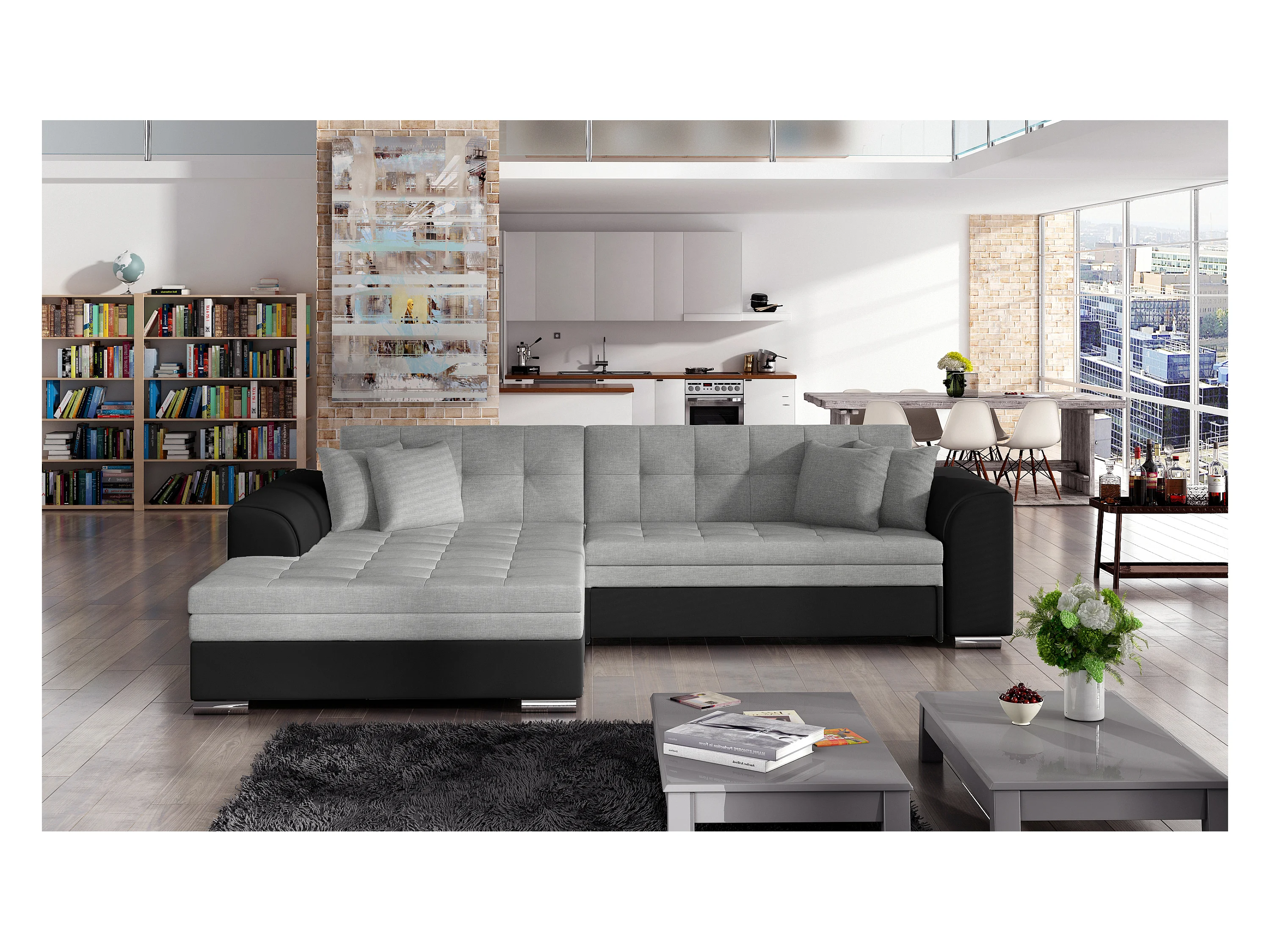 Canapé d'angle gauche convertible 4 places tissu gris clair et simili noir Looka 295cm
