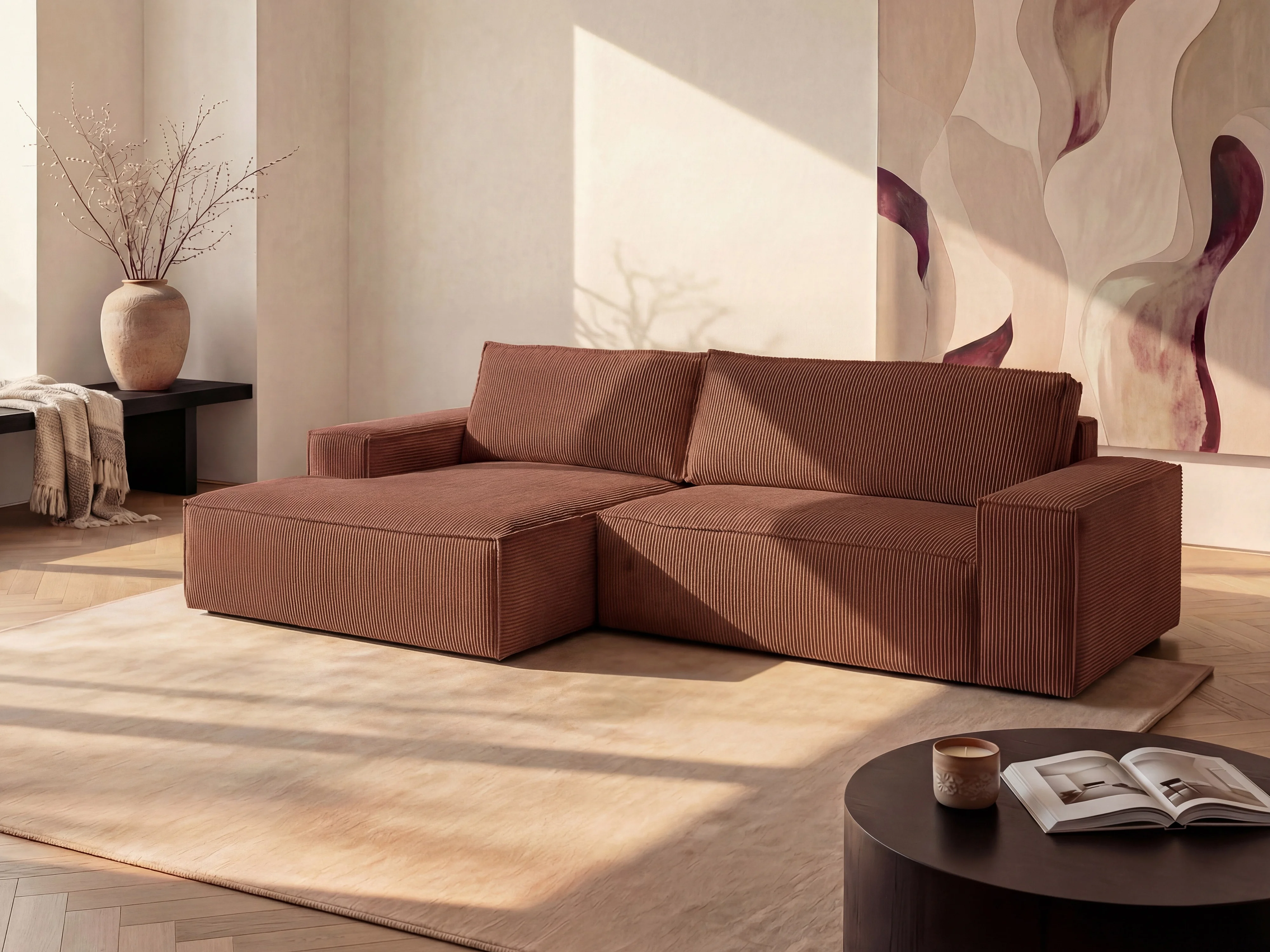 Canapé d'angle gauche convertible en velours côtelé rose AMELIA