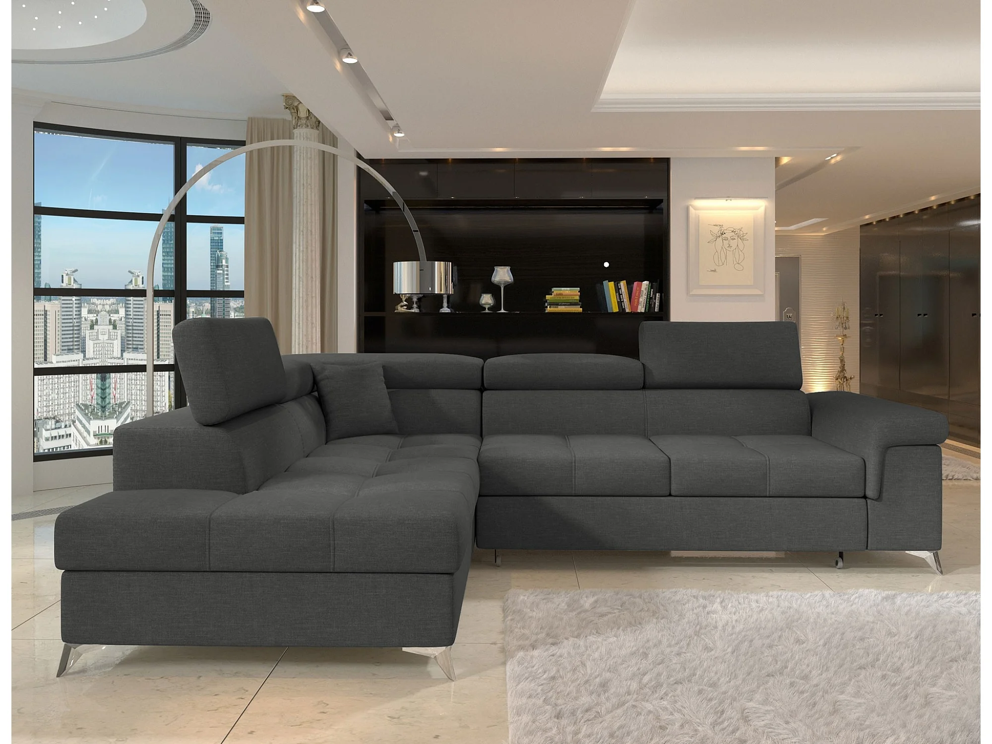 Canapé d'angle convertible tissu MARIDO - Coffre et appuis-tête réglables-Gris-angle gauche