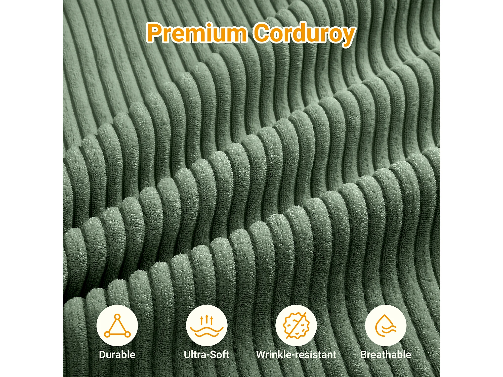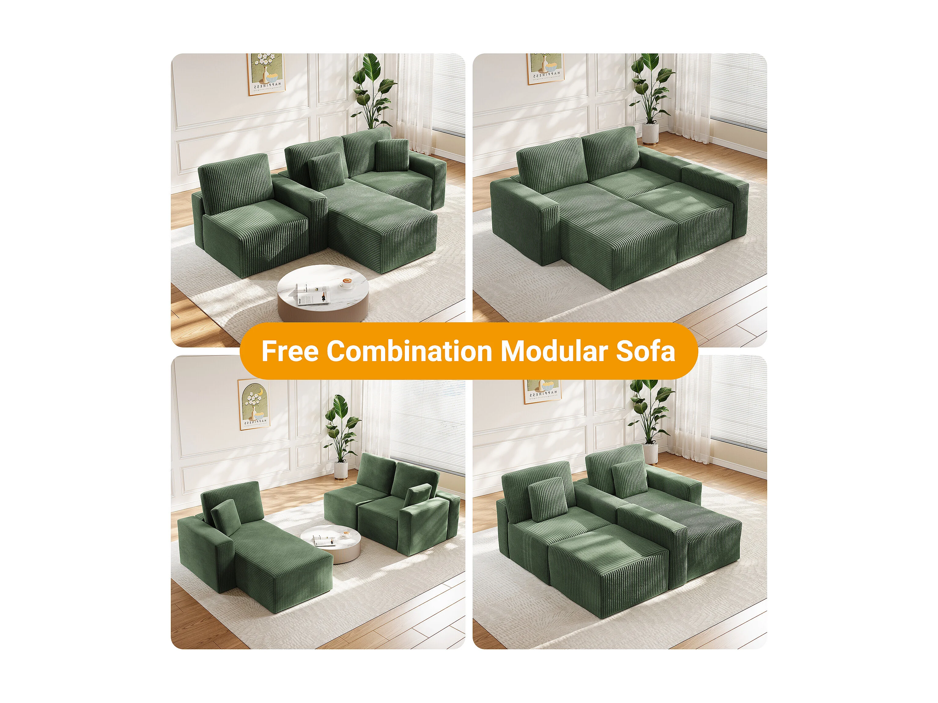 Canapé d'angle gauche modulable 3 places en velour côtelé, avec 2 oreillers, méridienne 70x125cm, Vert