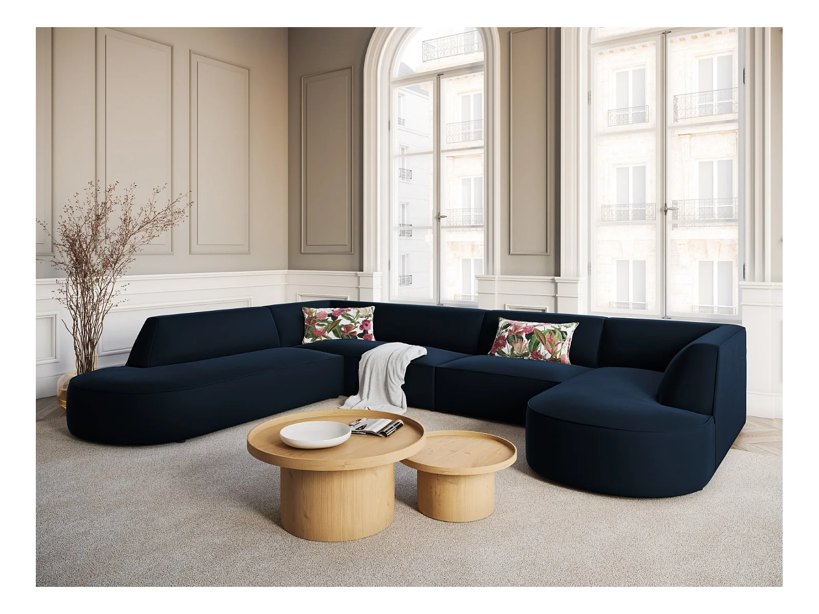 CXL by Christian Lacroix - Canapé d'angle droit panoramique "Charles" 7 places en velours bleu - 366x273x69cm