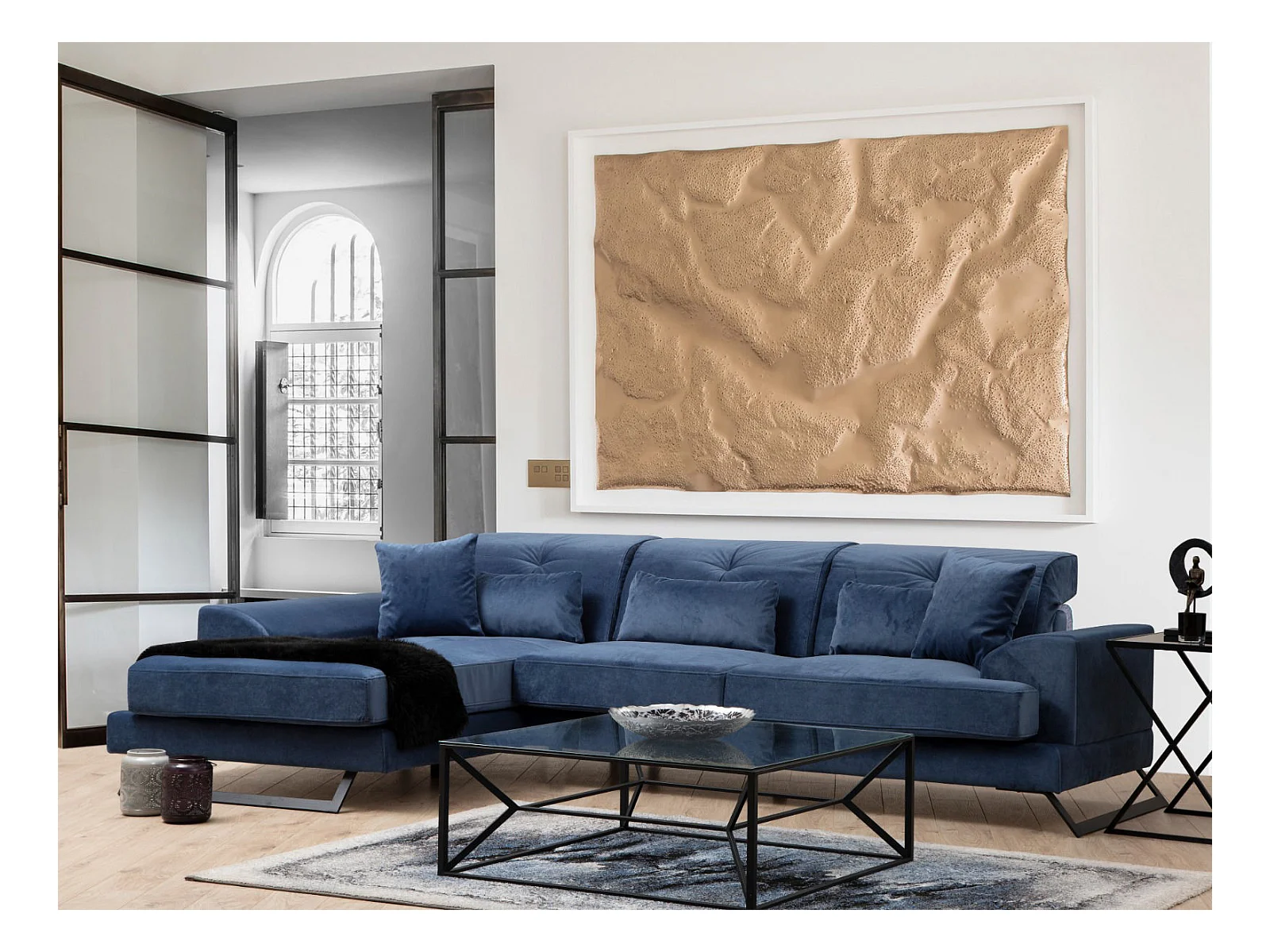 Canapé d'angle gauche design velours bleu marine et pieds acier noir Liza