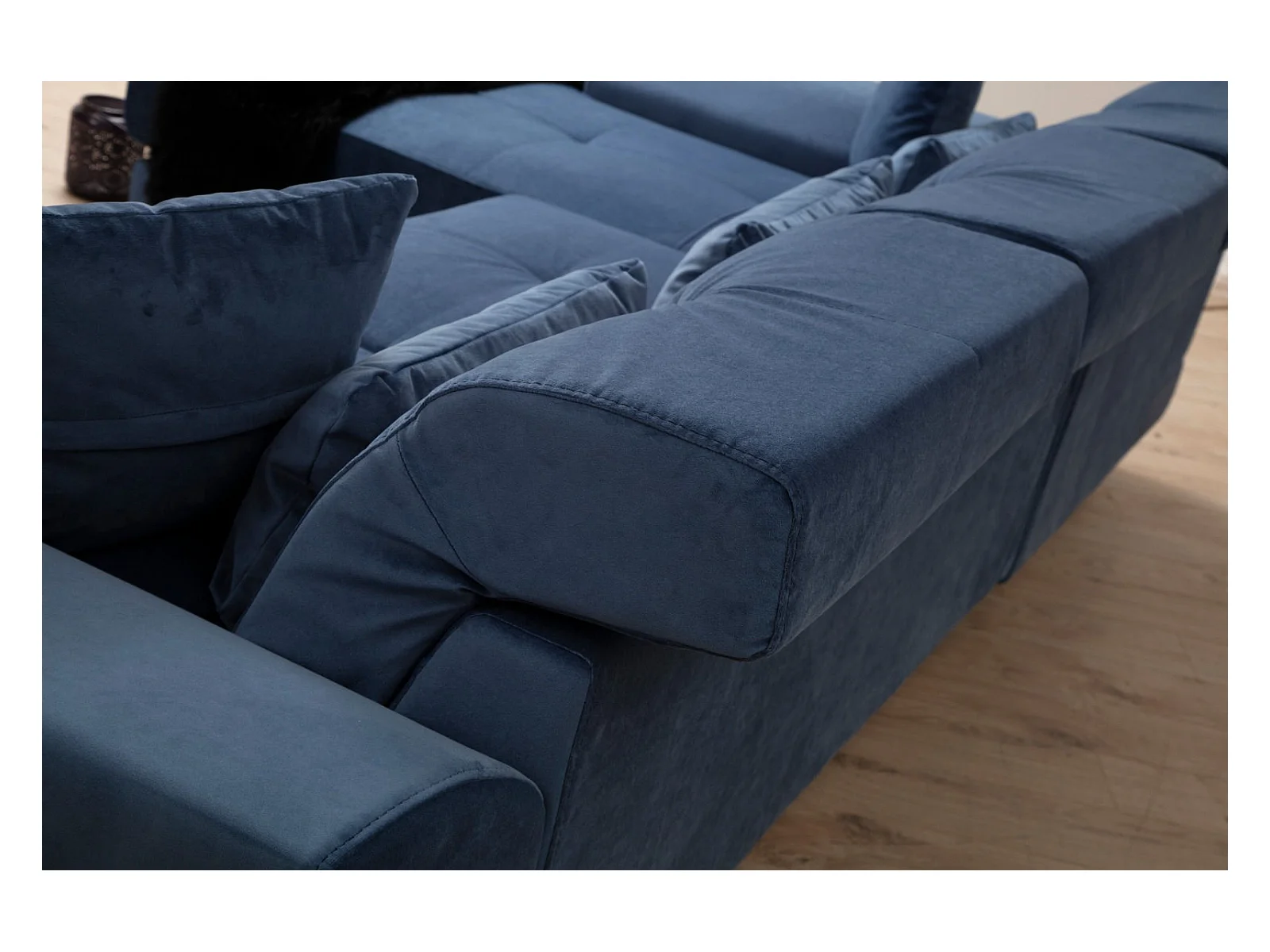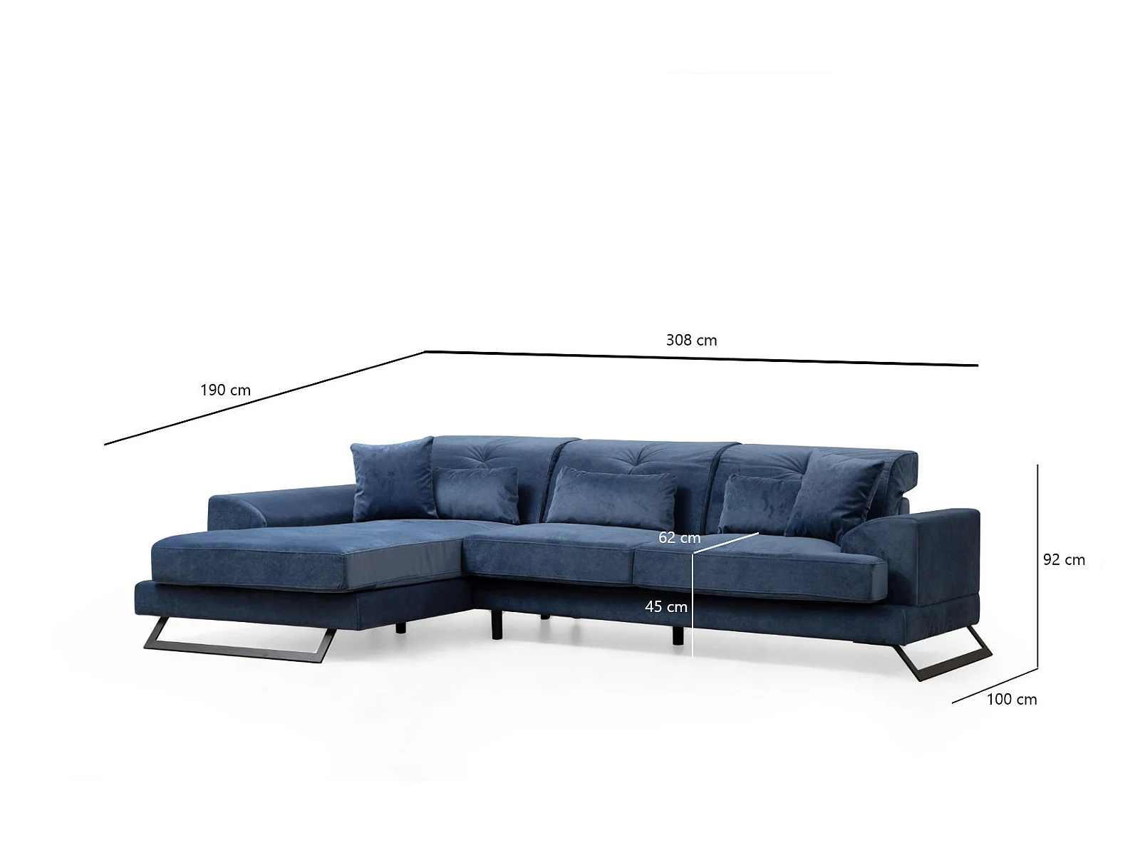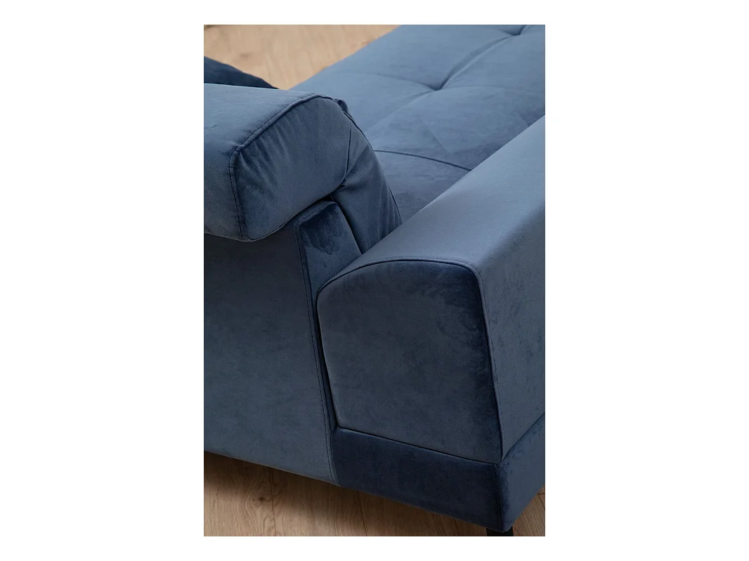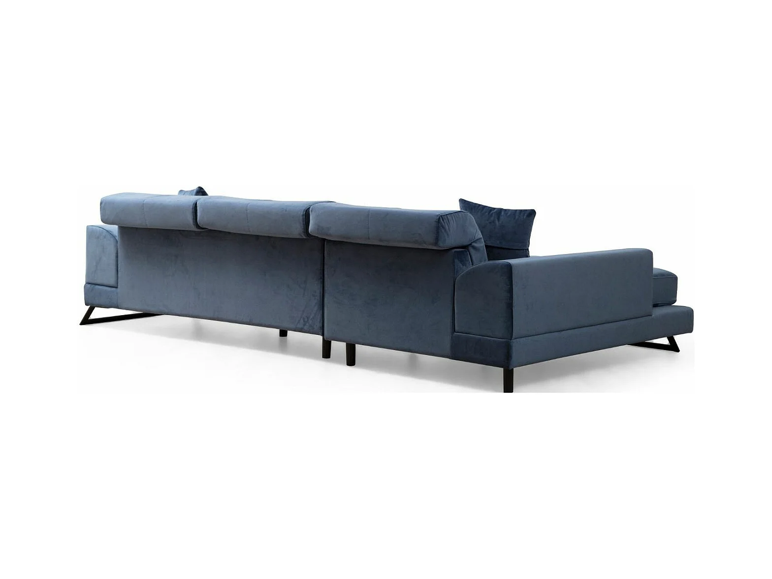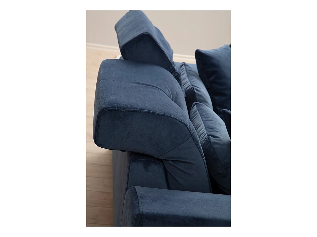 Canapé d'angle droit velours bleu avec têtières relevables et pieds metal noir Briko 308cm
