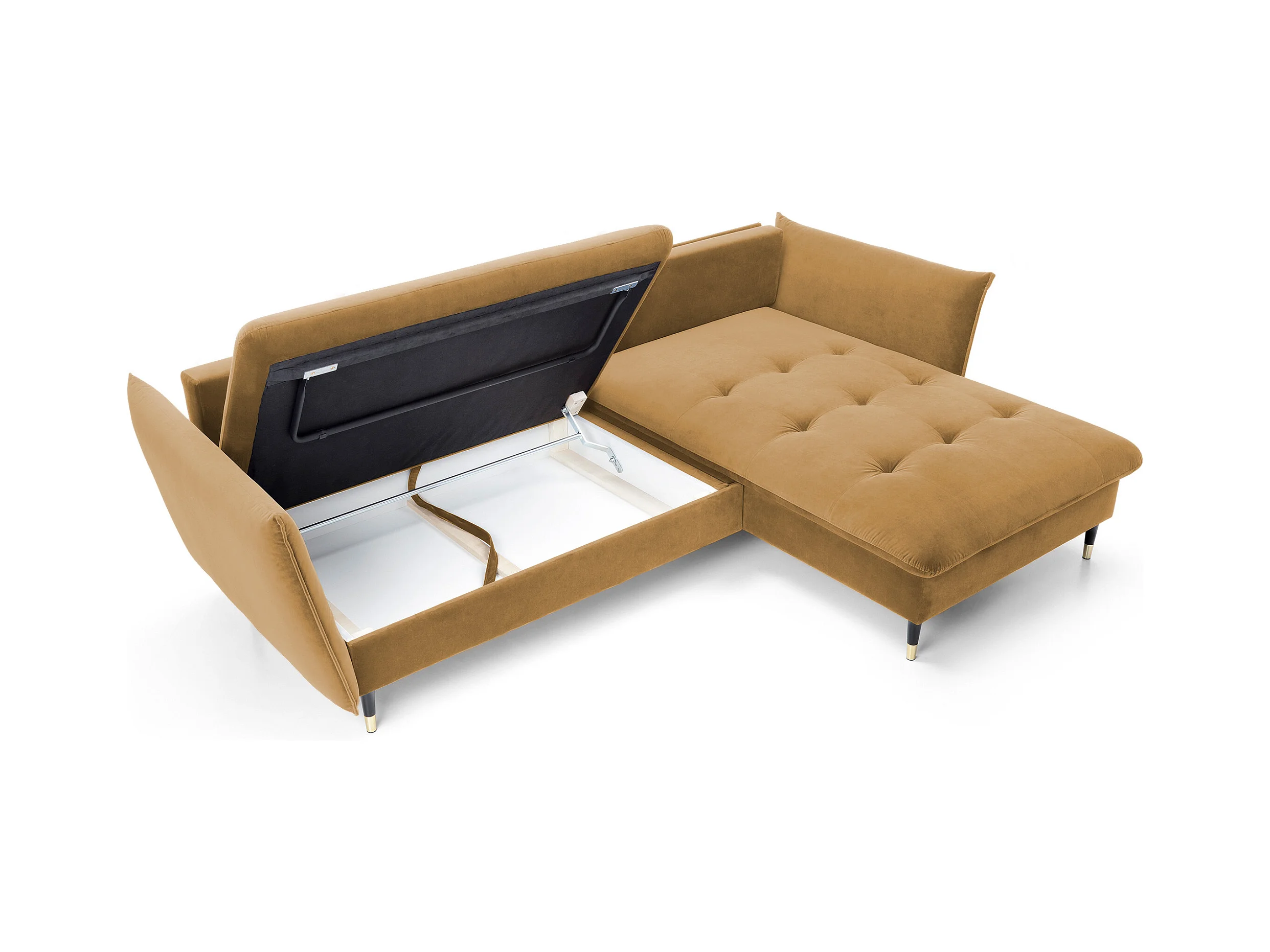 Canapé d'angle GLAM convertible, ottomane & pieds dorés – canapé en velours style glamour avec coussins déco, 258x167x91 cm, côté droit PLATINE