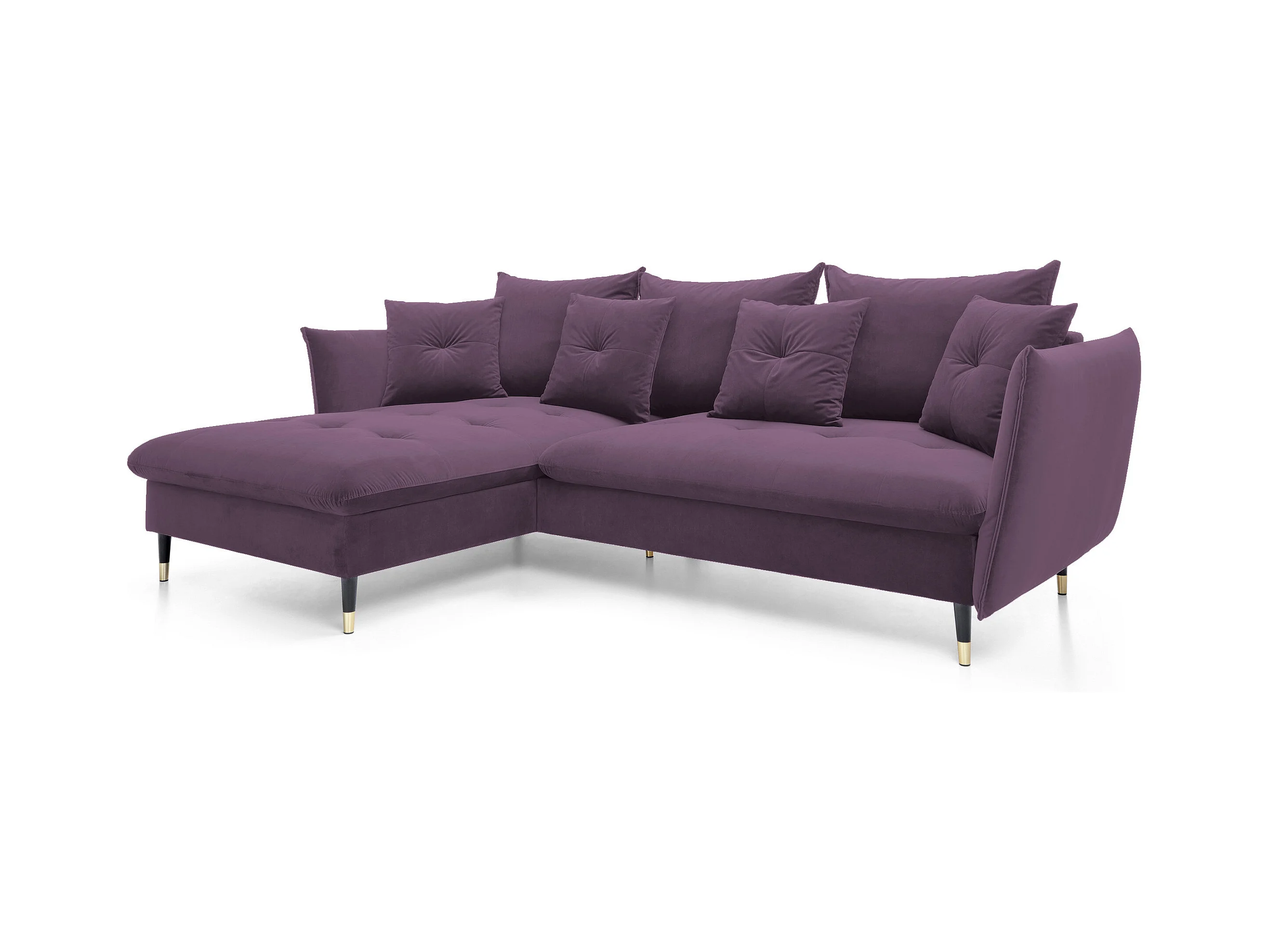 Canapé d'angle GLAM convertible, ottomane & pieds dorés – canapé en velours style glamour avec coussins déco, 258x167x91 cm, côté gauche LILA