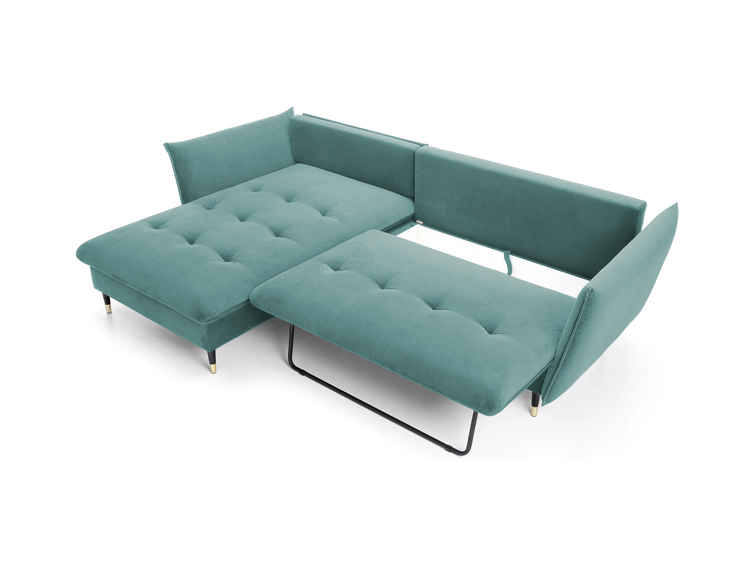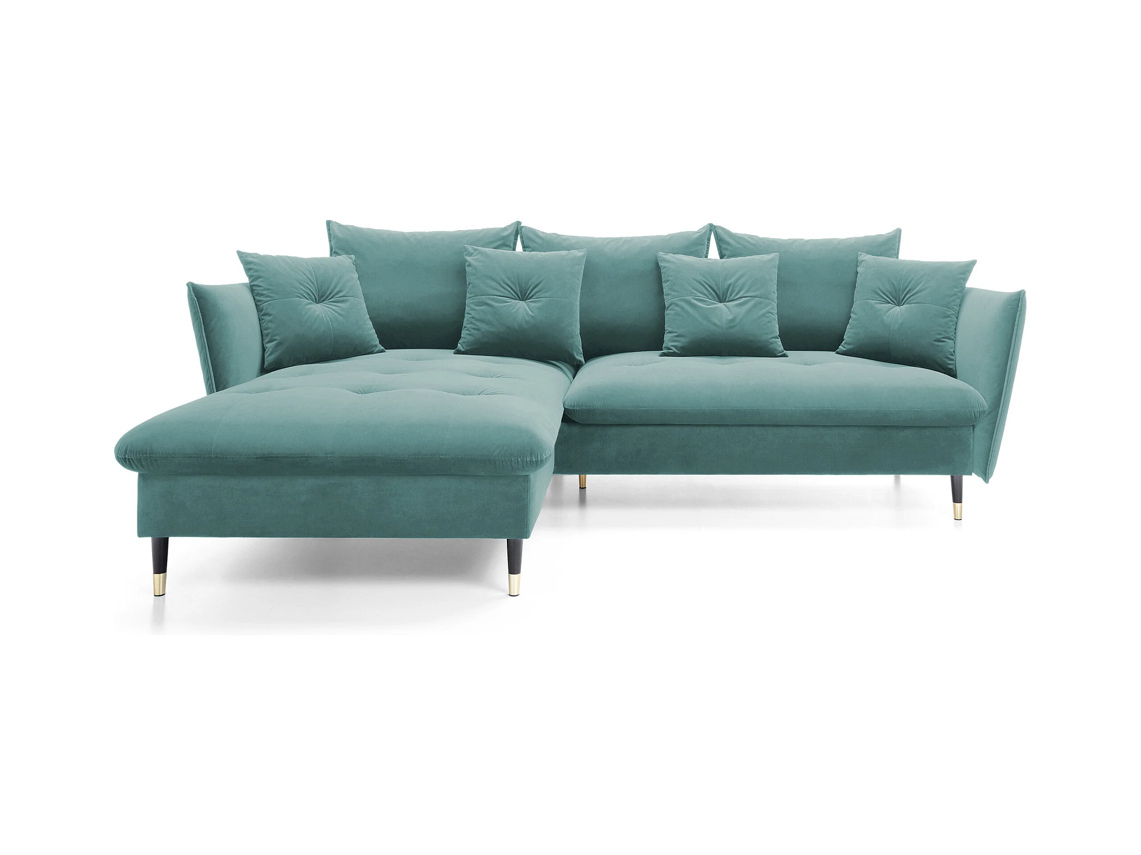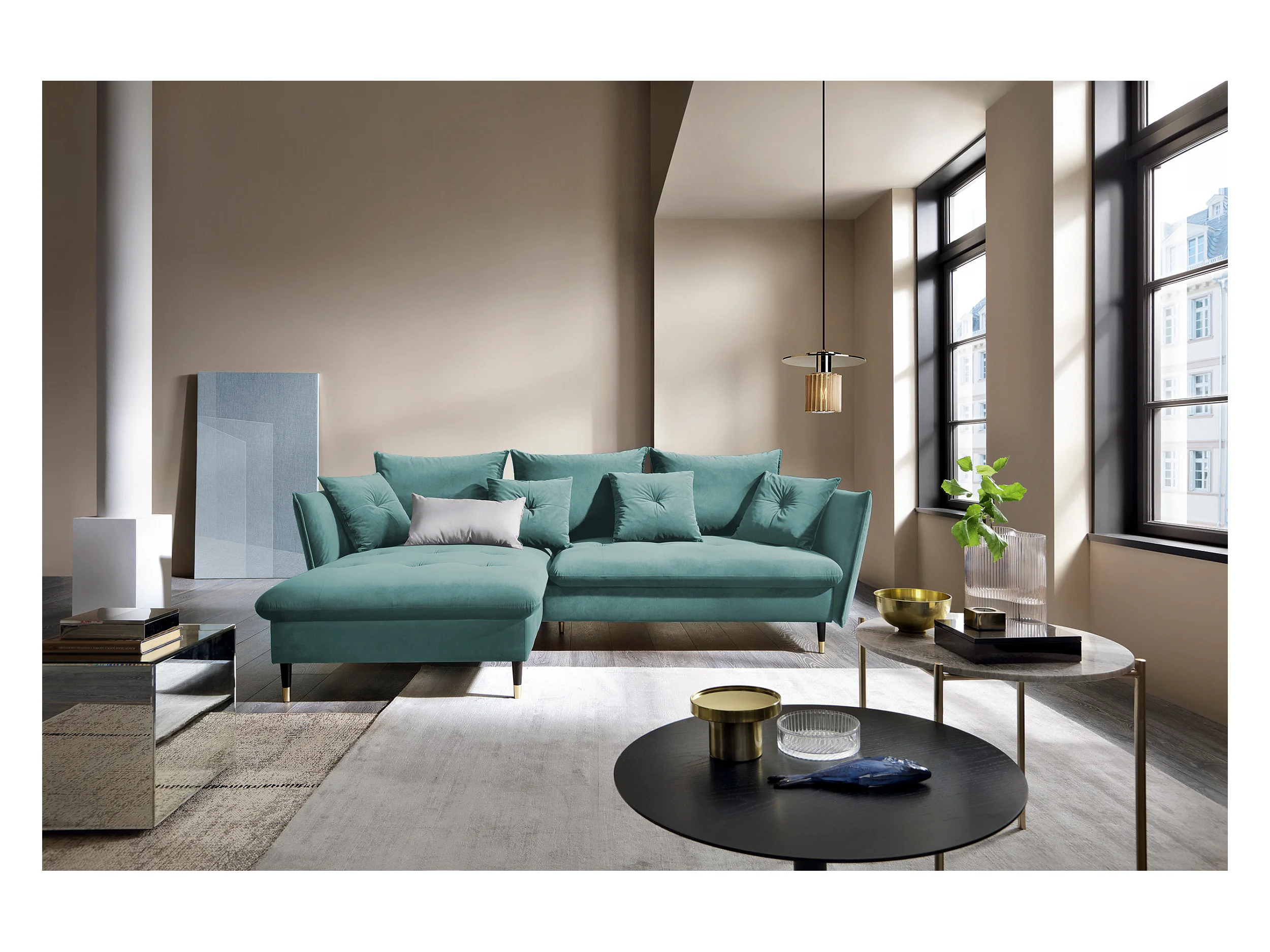Canapé d'angle GLAM convertible, ottomane & pieds dorés – canapé en velours style glamour avec coussins déco, 258x167x91 cm, côté gauche MENTHE