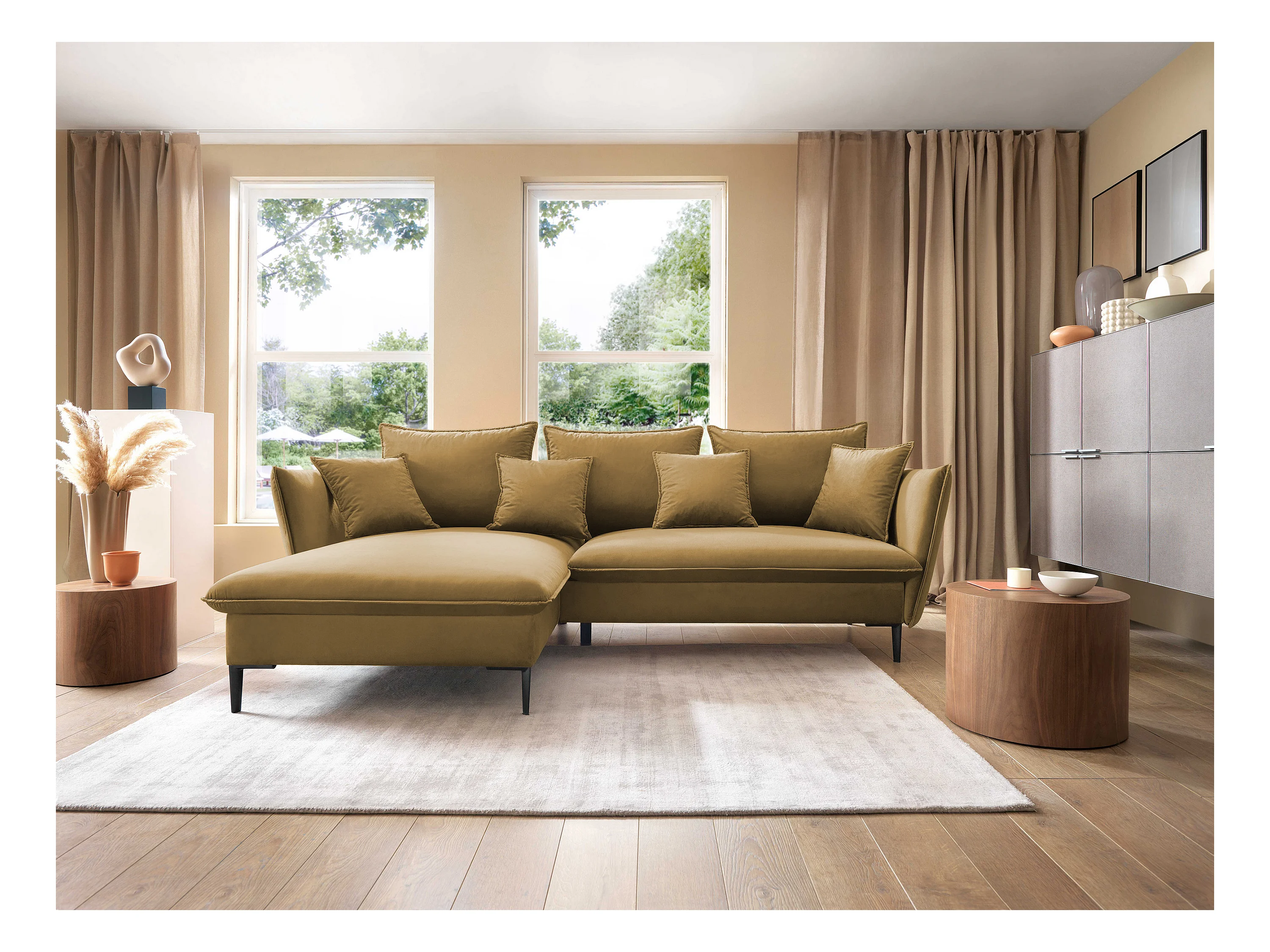 Canapé d'angle GLOSS convertible, ottomane & pieds dorés – canapé en velours style GLOSSour avec coussins déco, 258x167x91 cm, côté gauche LILA
