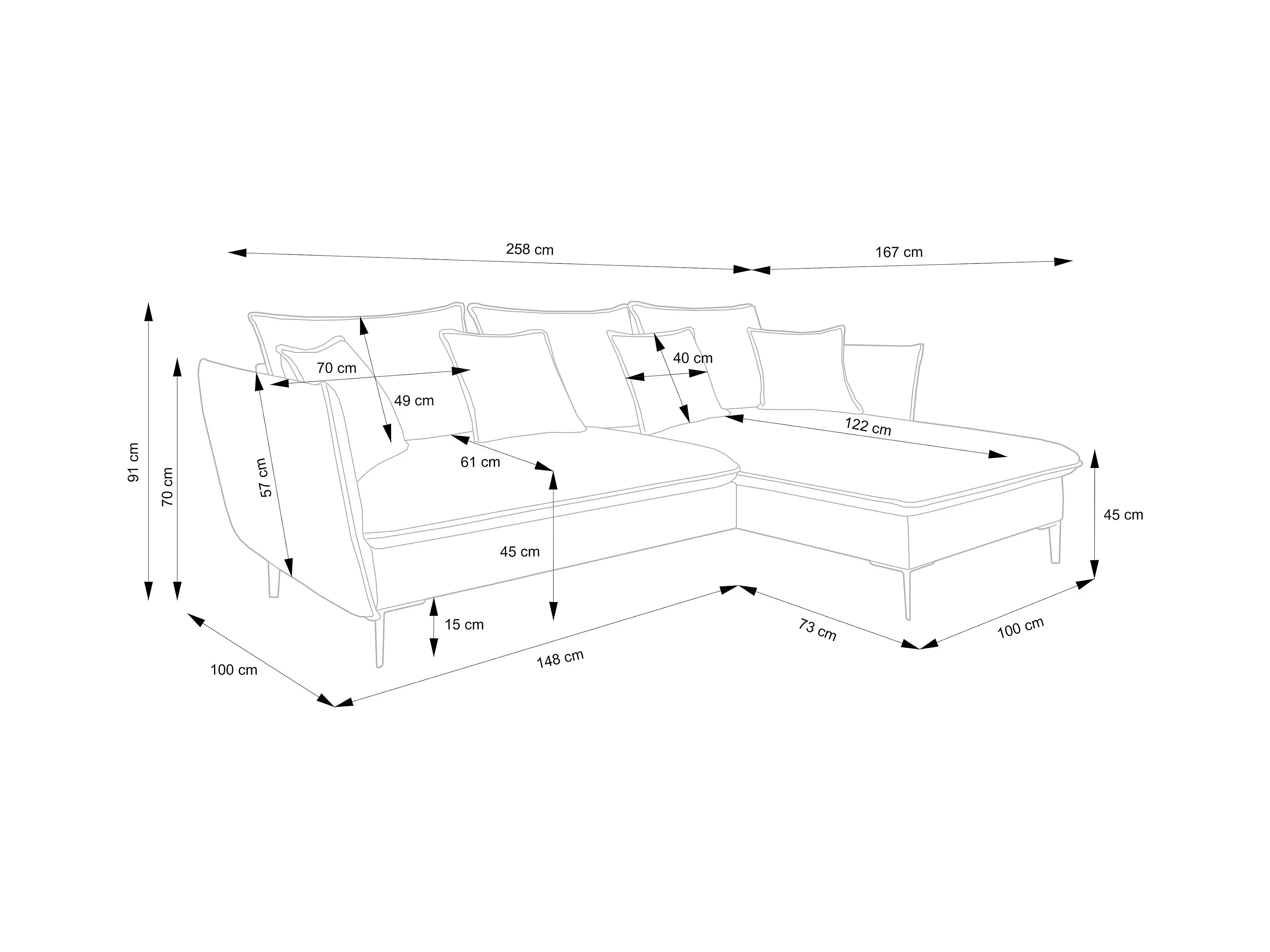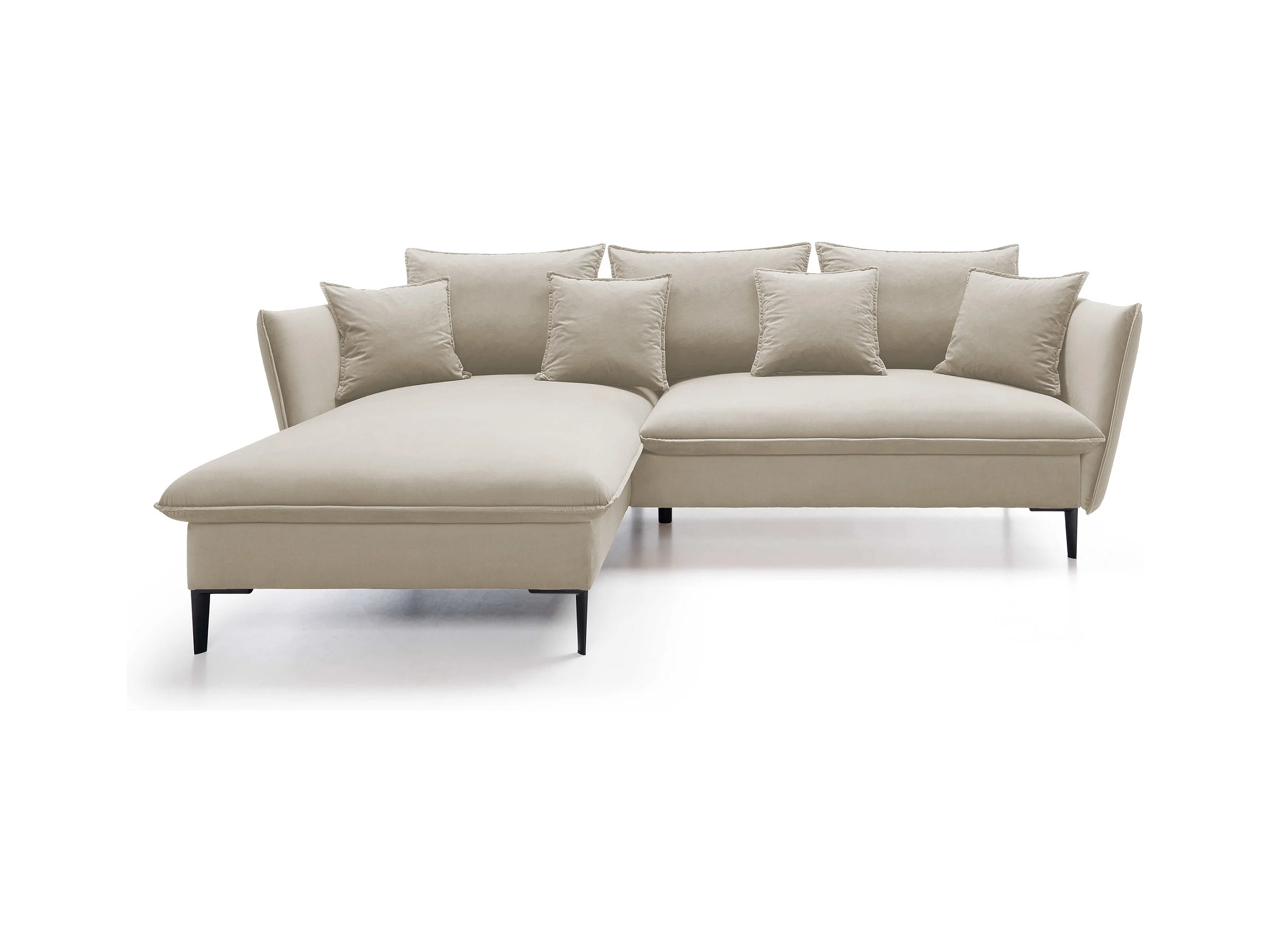 Canapé d'angle GLOSS convertible, ottomane & pieds dorés – canapé en velours style GLOSSour avec coussins déco, 258x167x91 cm, côté gauche PLATINE