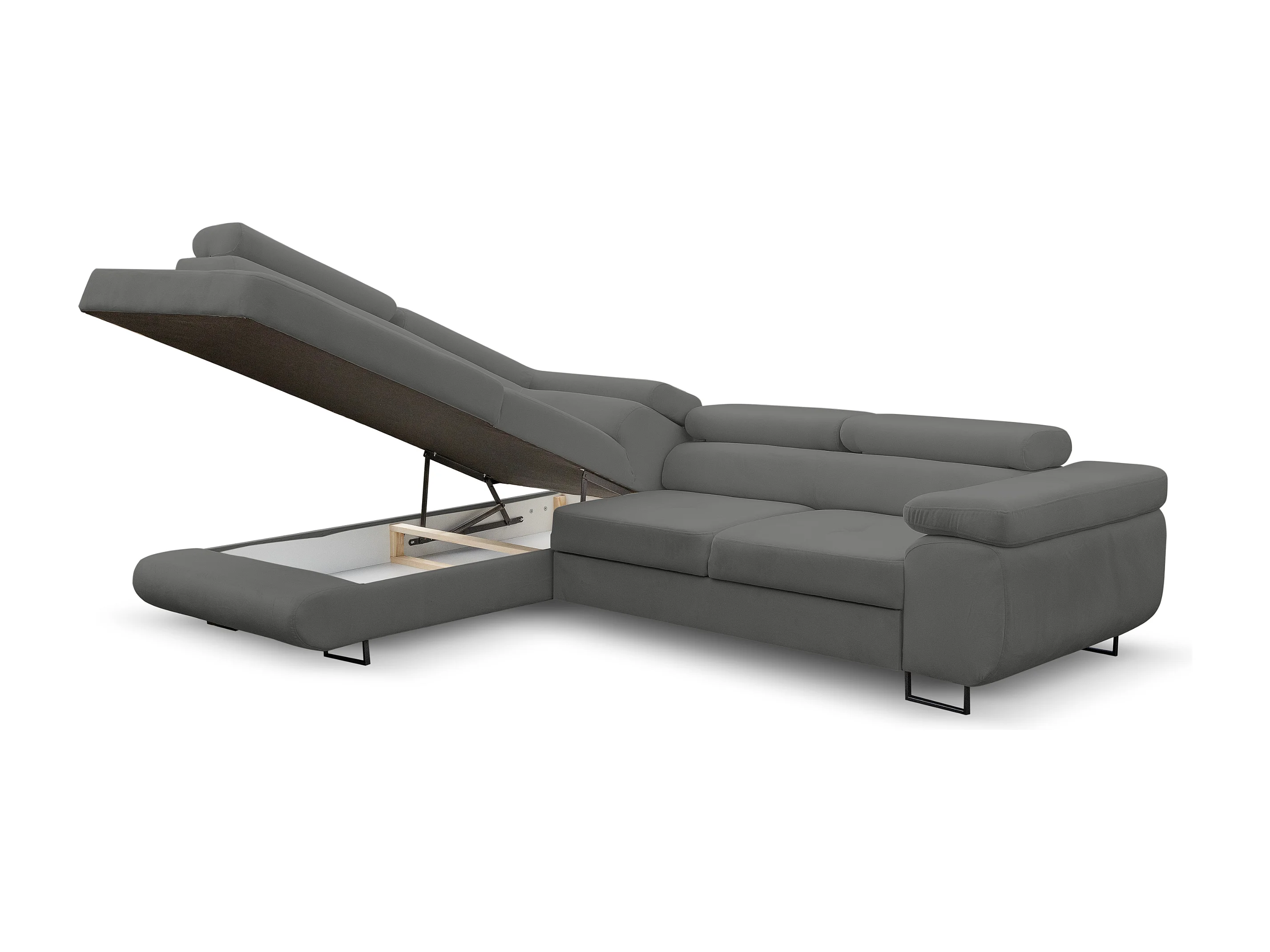 Canapé d'angle Jerry avec fonction couchage et coffre de rangement, couleur : gris, tissu velours, pouf gauche
