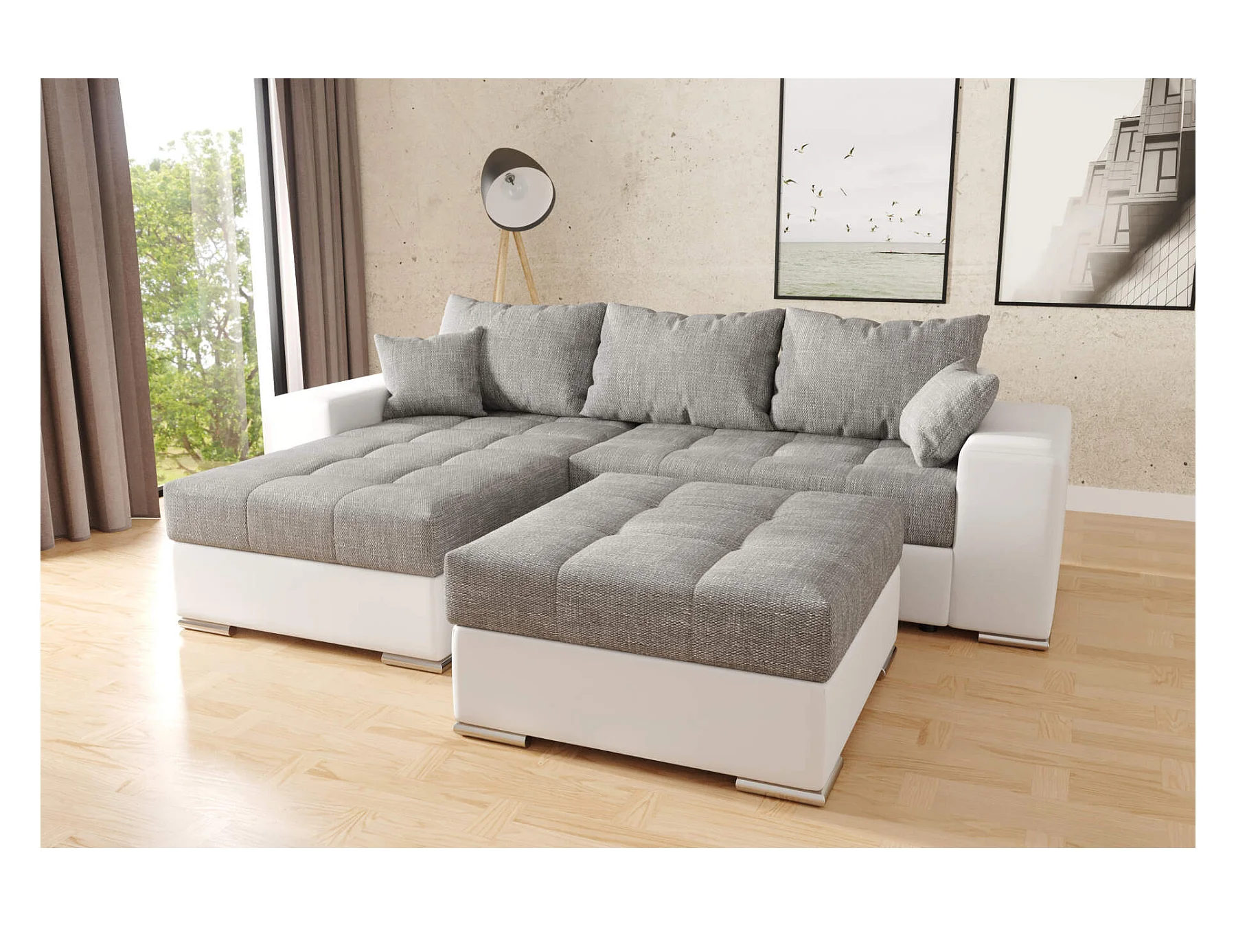 canapé d'angle josua L avec lit et rangements + pouf - gris + blanc