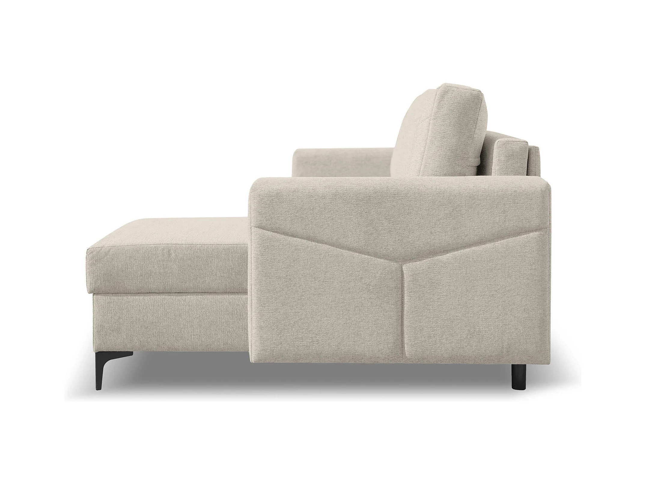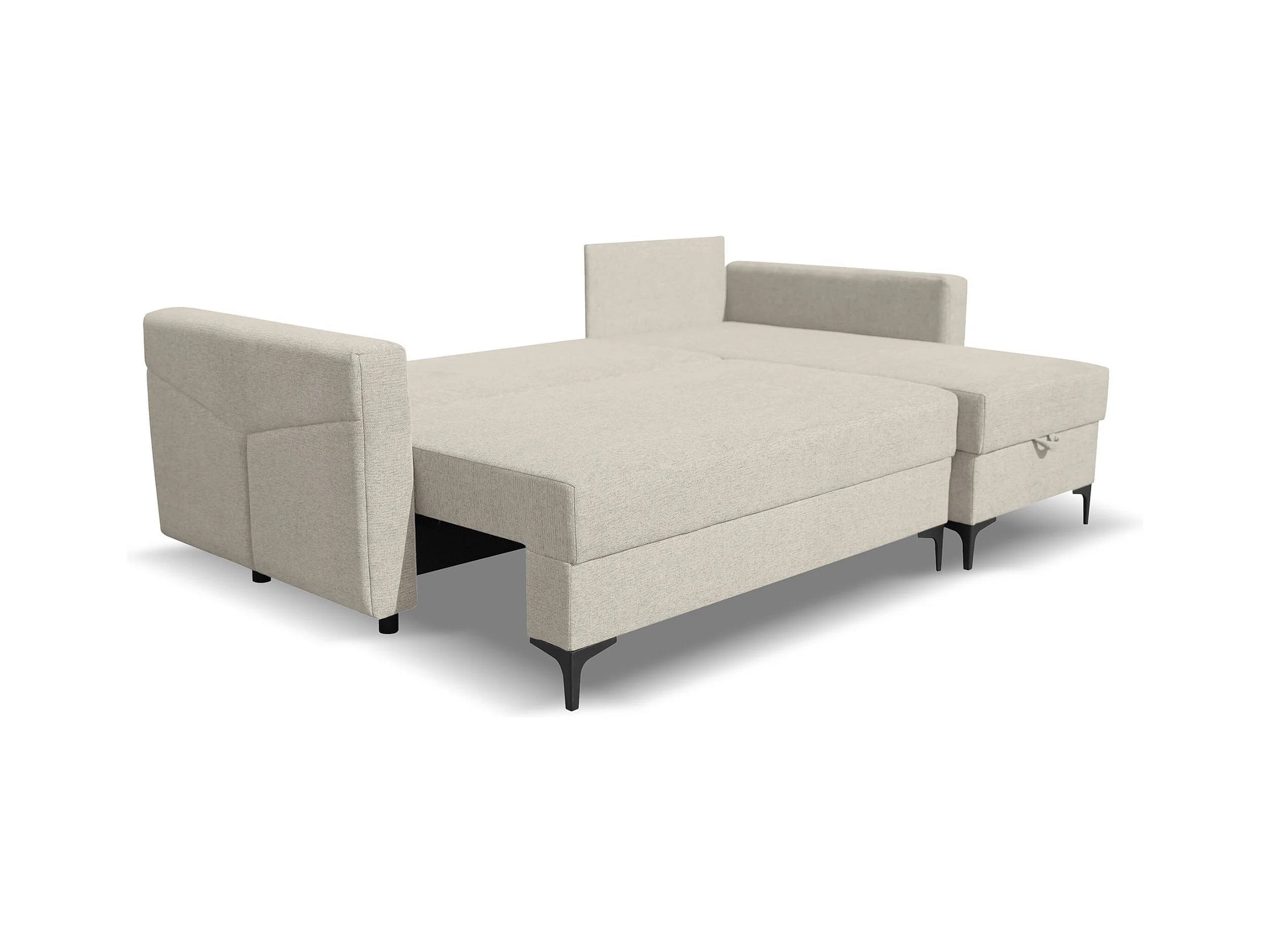 Canapé d'angle Hugo L avec fonction couchage et coffre de rangement, couleur : beige, tissu cordé, pouf universel