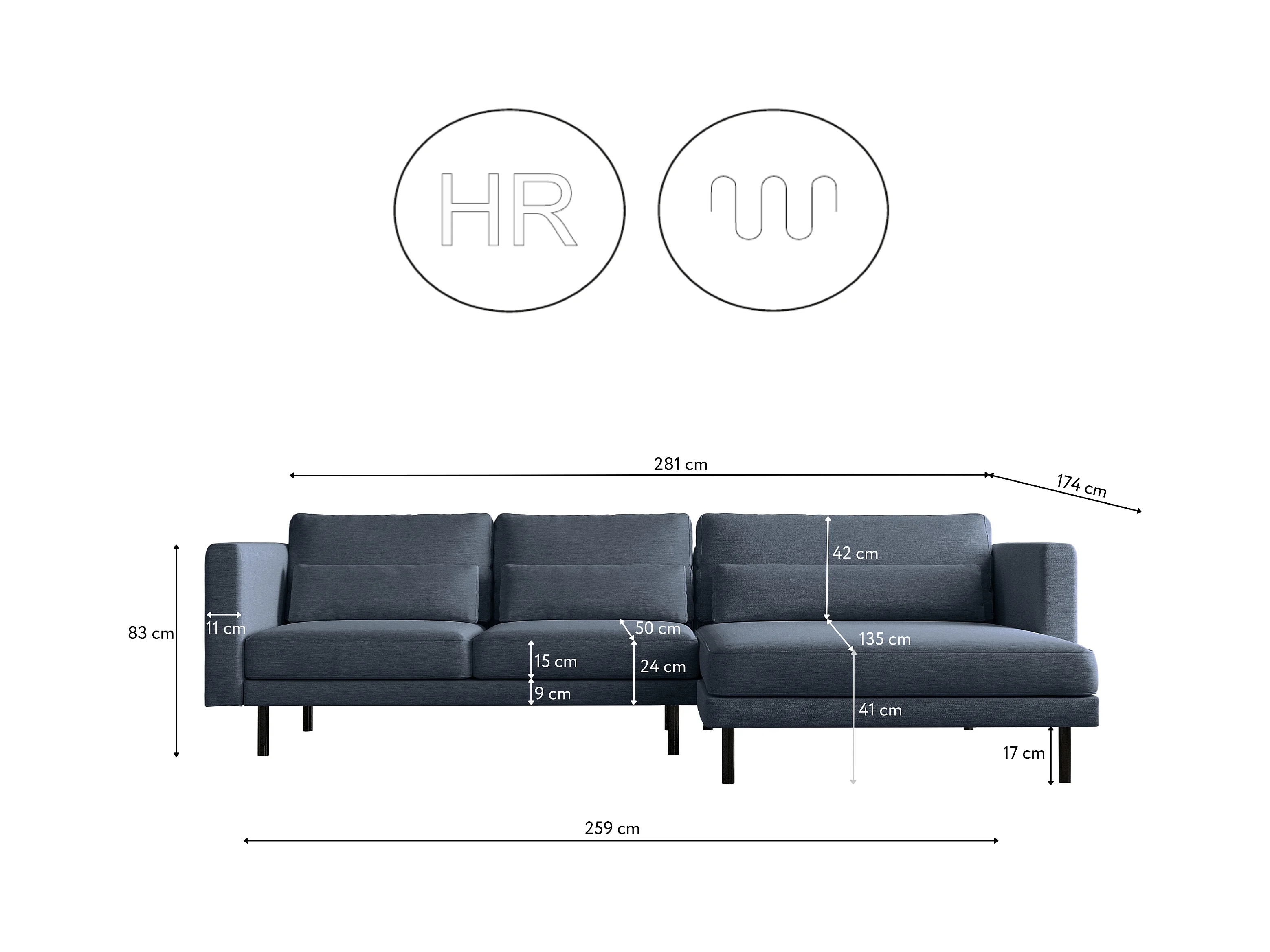 Canapé d'angle PULA en L, tissu Scala, Safira, droit
