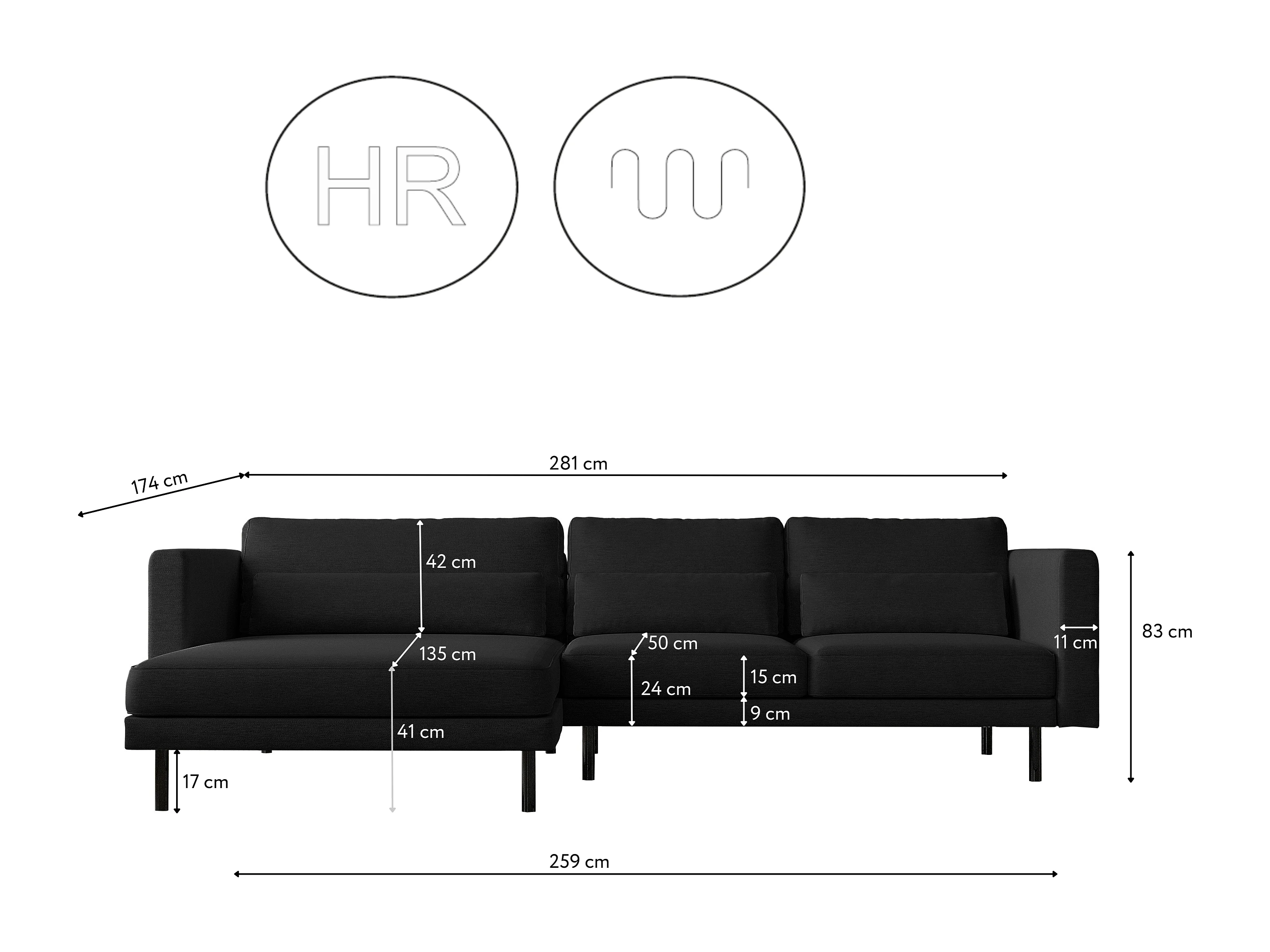Canapé d'angle L-form Dani moderne et spacieux tissu Verita Noir Gauche