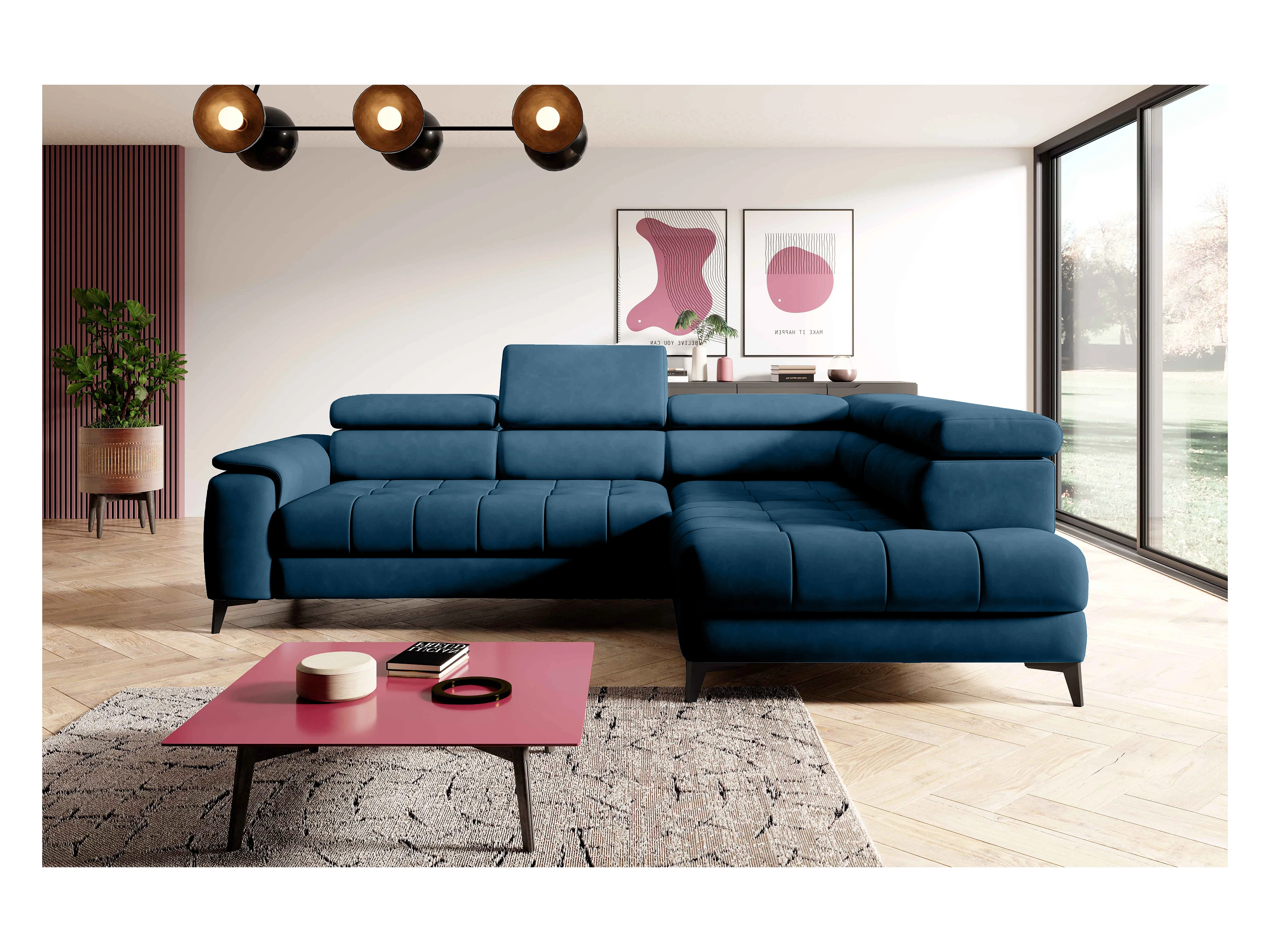 Canapé d'angle ILUSIO L avec fonction sommeil, 250x205cm, dossier réglable, matériaux de haute qualité, couleur bleue, droite
