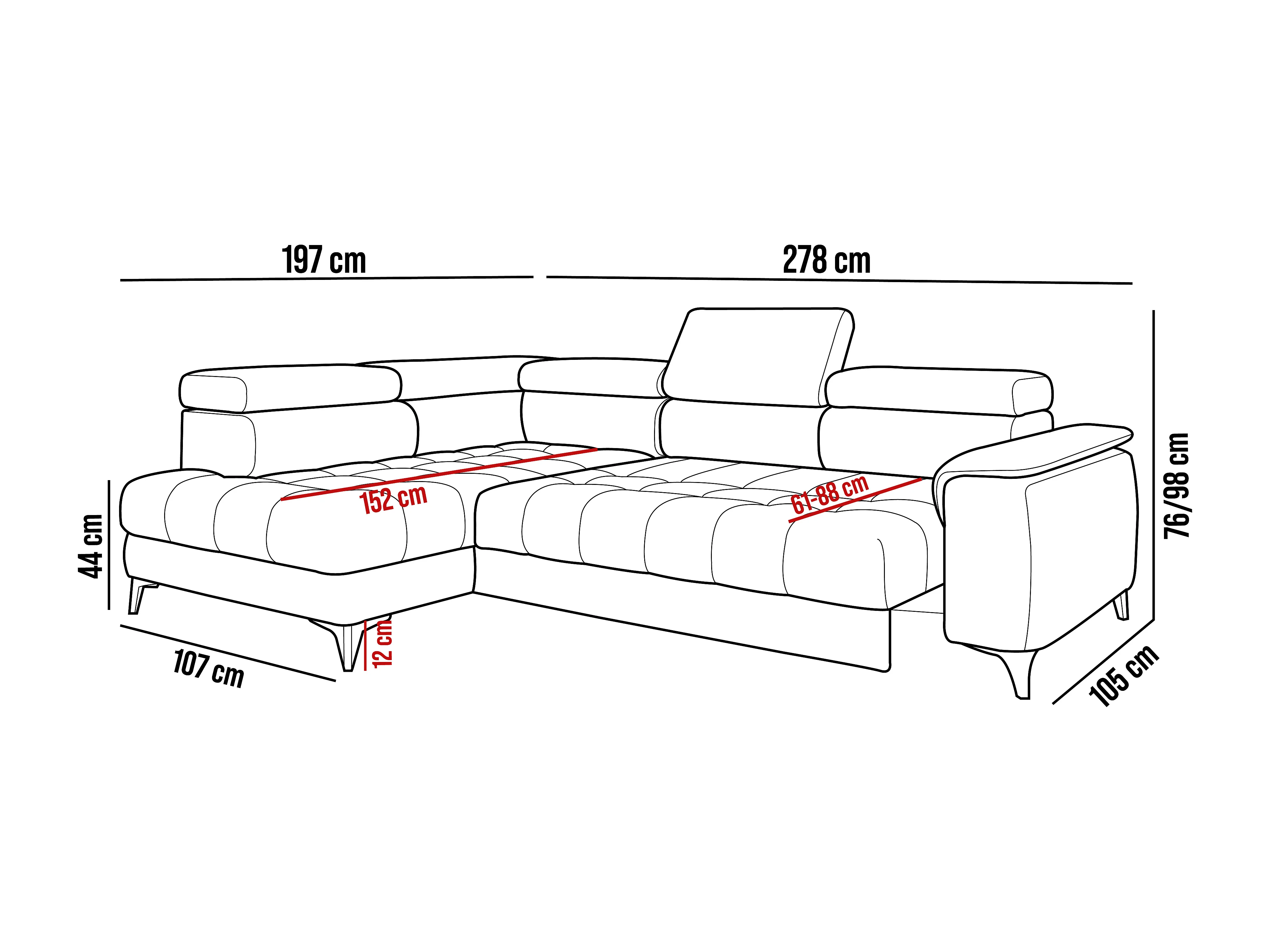 Canapé d'angle lit, têtières réglables, méridienne gauche, 278×197×76/98 cm, tissu rose poudré